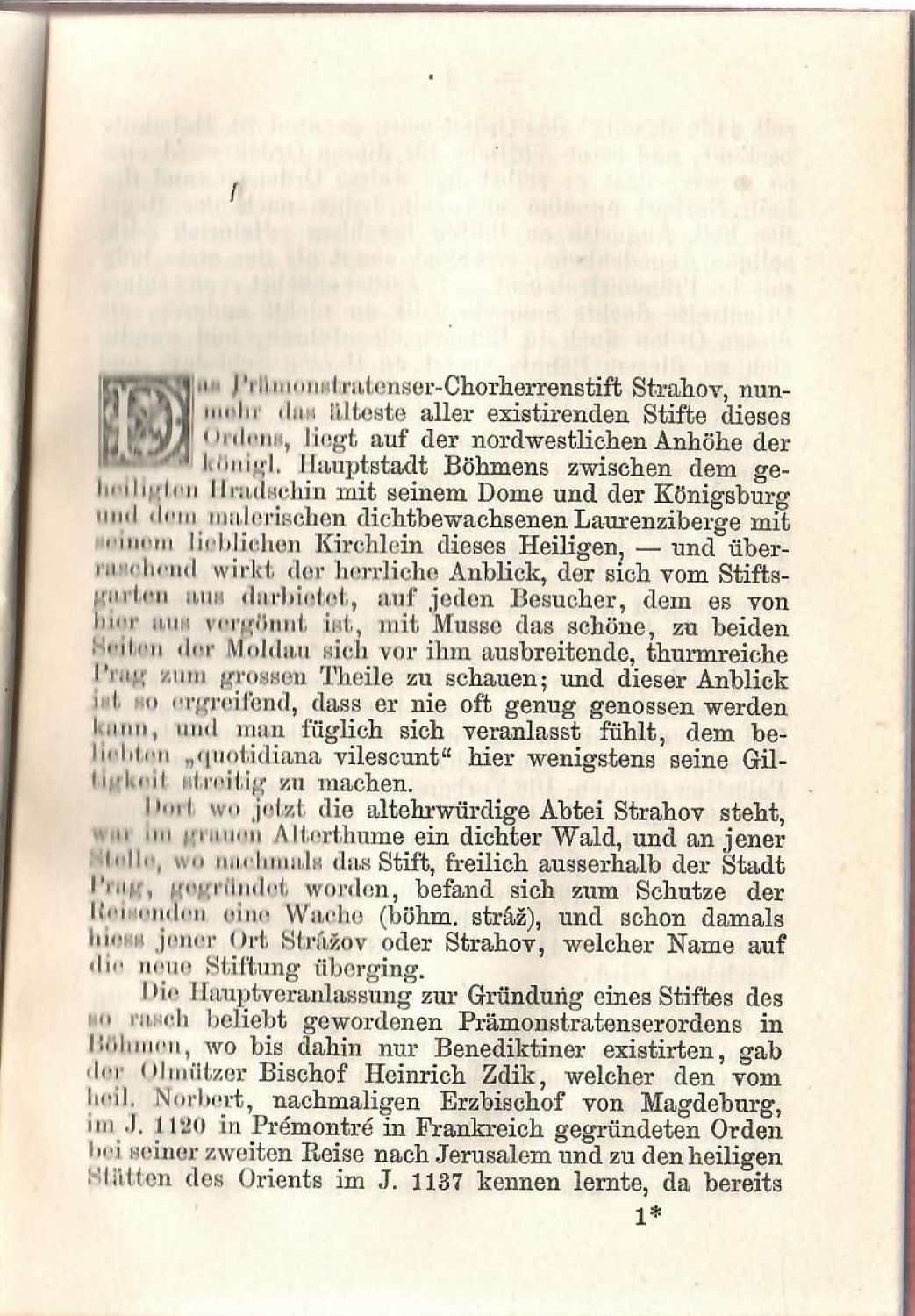 Tištěno antikvou, ve front. xylografie - celkový pohled na Strahovský klášter. - Dobová kožená vazba, na přední desce tlačený a zlacený rám v rozích zdobený ornamentem, v rámu mezi názvem rozděleným na dvě části tlačený a zlacený lehce pozměněný znak Strahovského kláštera. Na předním palistu podpis tužkou Jiřího Šalamouna.