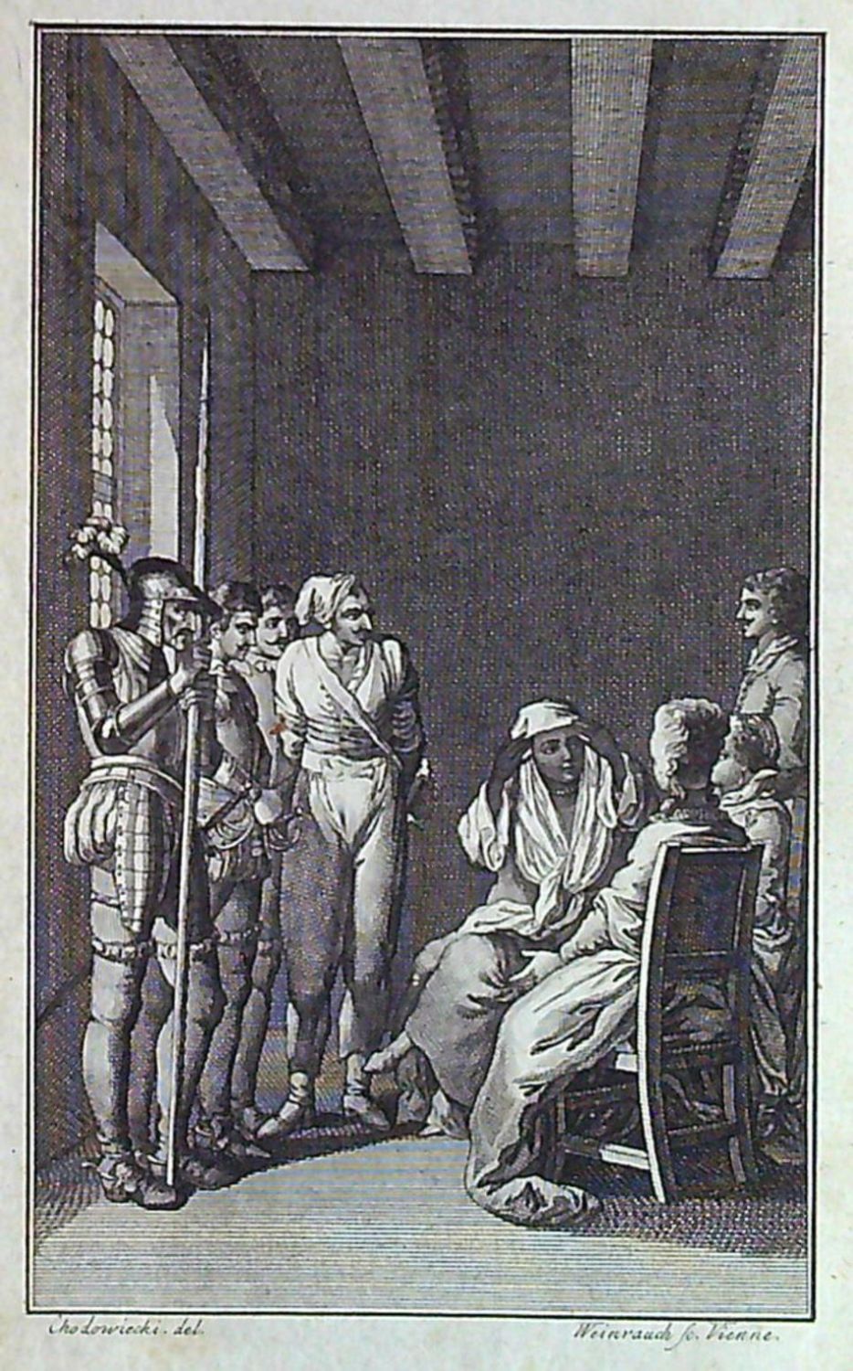 BCBT 13891<br>Tištěno gotikou, dvojité linky, tučně tištěné versálky, mizící linky. Na titulních listech všech šesti dílů mědirytiny v oválu (cca 69 x 56 mm) s vyobrazeními vztahujícími se k románu, ve front. všech šesti dílů mědirytiny, které dle Chodowieckého vyryl Weinrauch ve Vídni, na kterých jsou vyobrazeni Don Quixote a Sancho Panza v různých situacích. <br>Jednotné kartonové vazby potažené škrobovým papírem z 20. století. Na rubu titulních listů některých svazků staré provenienční maďarské razítko.<br>Do německého jazyka ze španělštiny přeložil Justin Friedrich Bertuch. Souborný katalog eviduje v Čechách pouze dvě kompletní vydání v NK ČR v Praze a v Moravské zemské knihovně v Brně.