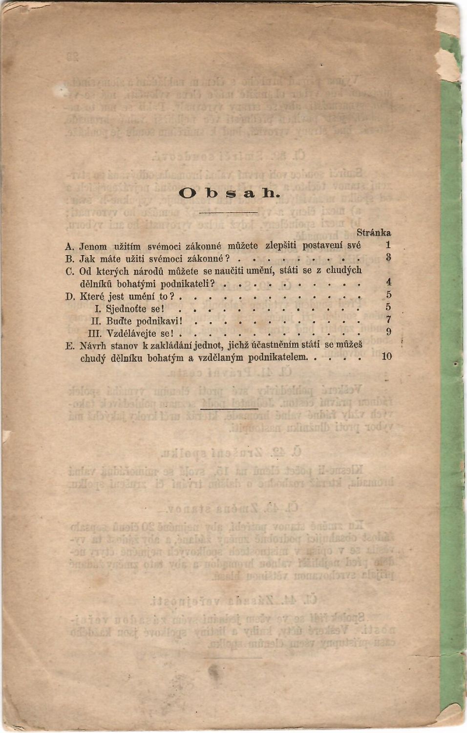 Na zadní straně obálky obsah, původní brožurka přes hřbet přelepená pův. pap. zelenou páskou, při spodním i horním okraji hřbetu kousek pásky chybí.