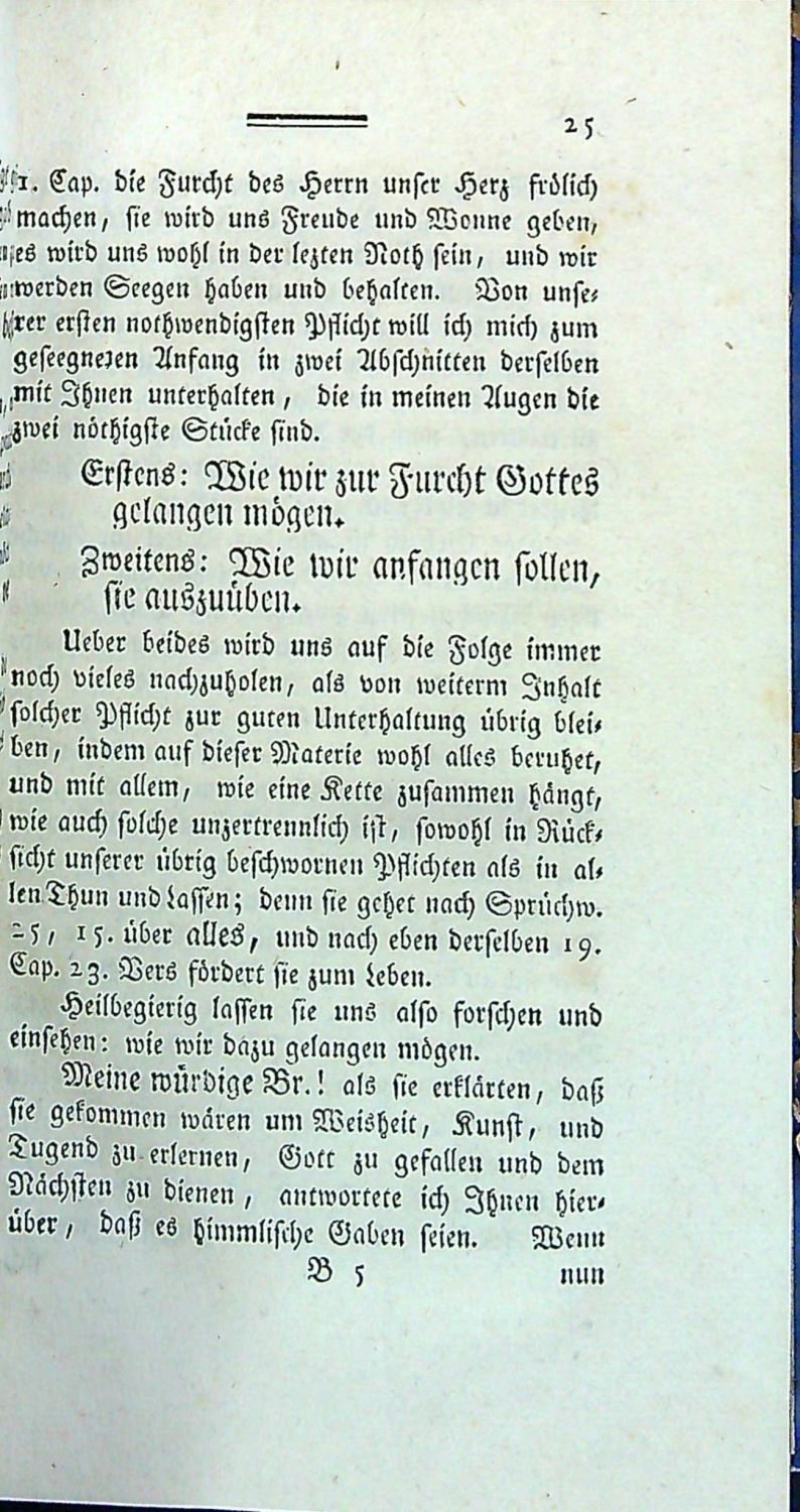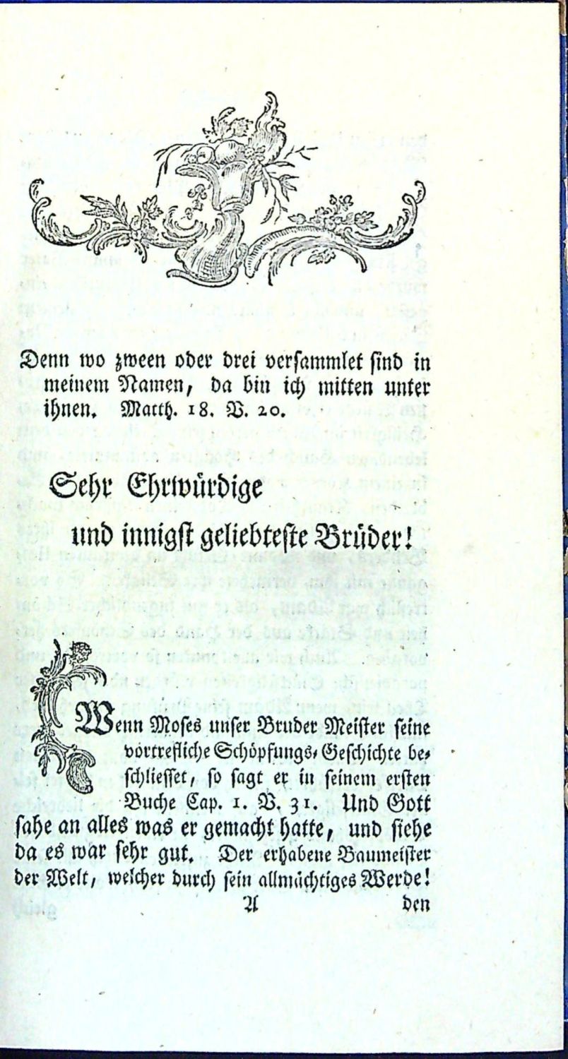 Wolfstieg 42513; Caillet 11471; Kopp II,225.<br> Tištěno švabachem, dřevorytové vlysy, lišty a tyče z ornamentů, viněty. Uprostřed horního okraje stran mizící dvojitá linky, dvě versálky zasazené v rostlinné kompozici, mizící dvoulinky. - V některých pramenech je mylně jako autor uváděn Johann Christoph Woellner. V knize autor vysvětluje přísahy a povinnosti členů řádu Zlatého a Růžového kříže sepsané ve vězení doplněné o dopisy adresované bratrům v řádu.<br>Kartonové desky potažené modrým papírem, modrý plátěný hřbet z počátku 20. století, při horním okraji hřbetu tlačený a zlacený název. Vazba ohmataná a místy lehce odřená, naražené rohy, při horním i spodním okraji okraji hřbetu torsa pap. knih. štítků, na předním přídeští pap. štítek "Loge Balduin z. L. Leipzig", na tit. listu staré razítko stejné zednářské lóže. Papír místy lehce zahnědlý, na několika listech drobné hnědé skvrnky.