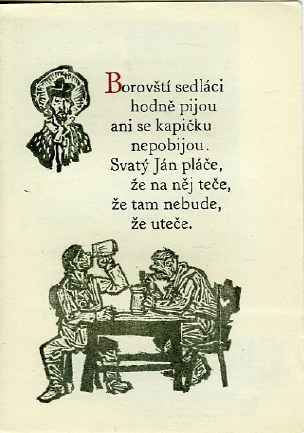 Jeden z neudaného počtu výtisků, které pro své přátele k Vánocům a novému roku 1965 upravil a na ručním lisu vytiskl Alois Chvála. - Obálka ve hřbetě odřená, na horním okraji mírně pomačkaná, listy čisté.