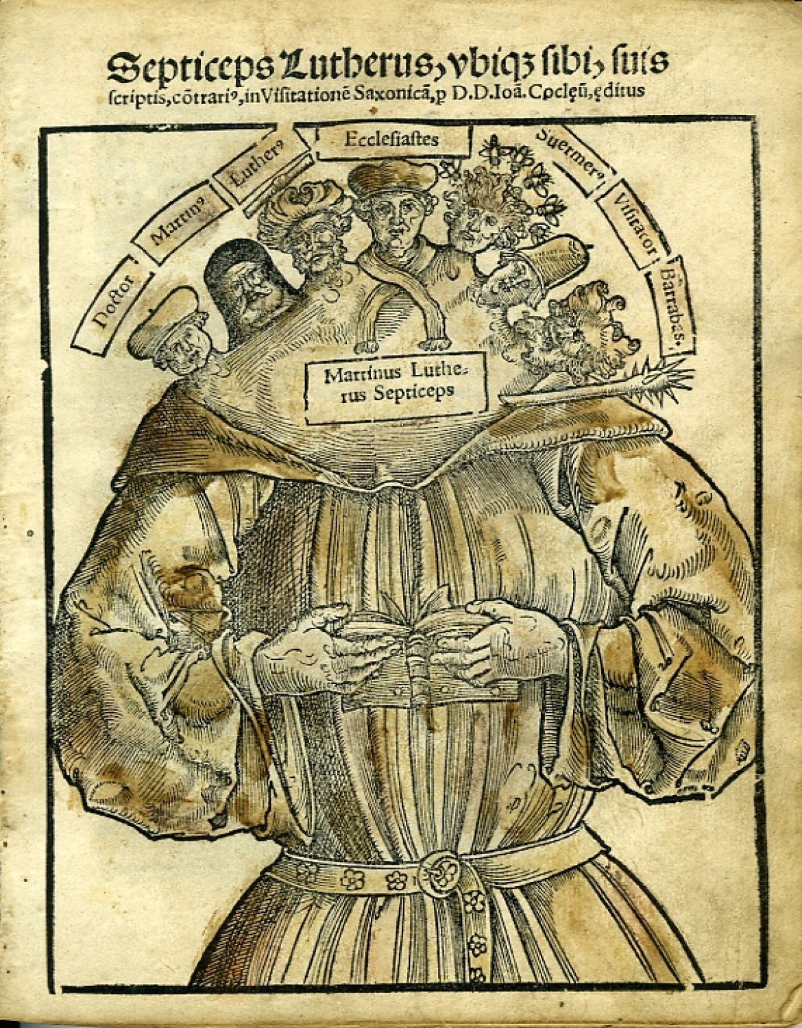 | Ilustrace: | Na tit. listu dobově ručně hnědou barvou tónovaný dřevořez v tučně tištěném jednoduchém rámečku o rozměru 162 x 132 mm karikující Martina Luthera, jenž je vyobrazen jako sedmihlavý mnich, čtoucí v knize; jednotlivé hlavy jej tištěnými nadpisy charakterizují jako: "doktora", tj. učence přednášejícího na wittenberské universitě; bratra "Martina" čili augustiniánského mnicha; "Luthera" v turbanu coby nevěřícího; "kazatele", kážícího jen to, co chce lid slyšet; "snílka" neboli nebezpečného fantastu; "visitátora", karikujícího inspekční praxi soudobých biskupů; a konečně jako novozákonního lotra "Barabáše". Tři dřevořezové konturové iniciály v jednoduchém rámečku zalomené do výše 7-8-13 řádků s biblickými motivy v pozadí, 4 dřevořezové viněty. |