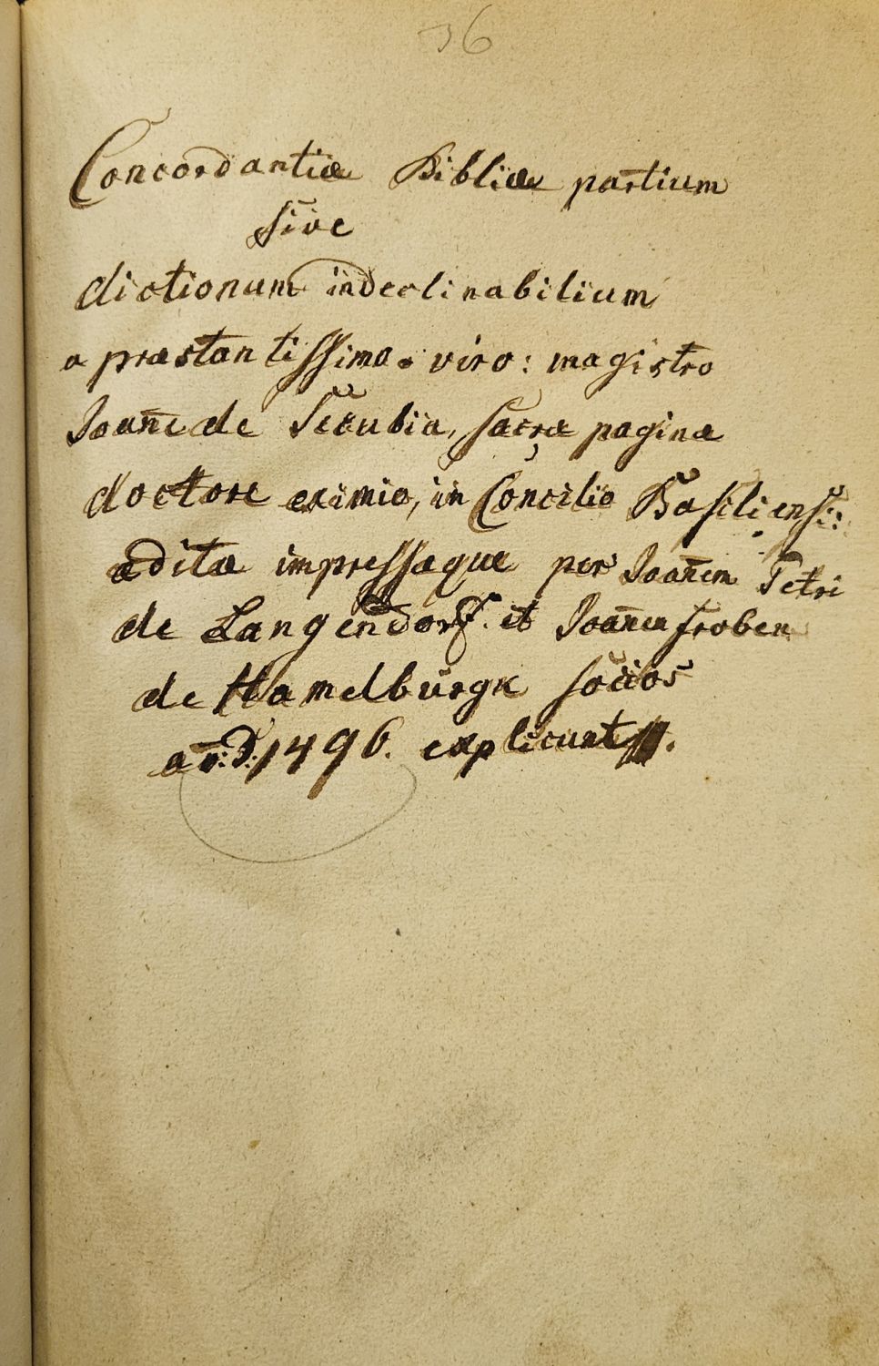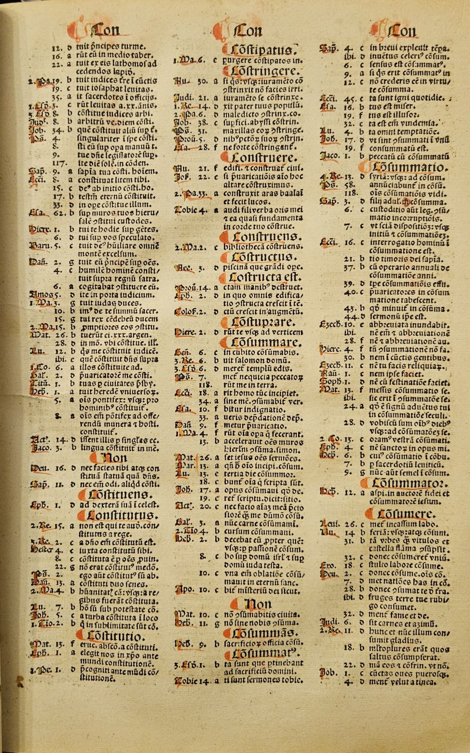 BMC III,791; Hain-Got. 5633; ISTC ic00853000; Hejnic 39; Šimáková-Vrchotka 611,612<br>Tištěno rotundou ve třech sloupcích, úvodní slovo v obou částech latinkou, 76 řádků, živá záhlaví, signatury. Konturové červeně malované iniciály a rubriky. Dva titulní listy a dva kolofony. První titulní list "Concordantie maiores biblie tam dictionu[m] declinabiliu[m][quam]indeclinabiliu[m] dilingeter vise cum textu ac sc[u]dum vera[m] orthograuiam emendate", druhý na listu 364a "Concordantie partiu[m] siue dictionum indeclinabiliu[m] totius biblie".<br>Nová pergamenová vazba, při horním okraji hřbetu nový vínově červený kožený štítek s tlačeným a zlaceným názvem, barvené ořízky, ochranné kartonové pouzdro. V poslední složce přehozené listy (PP1-2 vevázány za list PP6).
