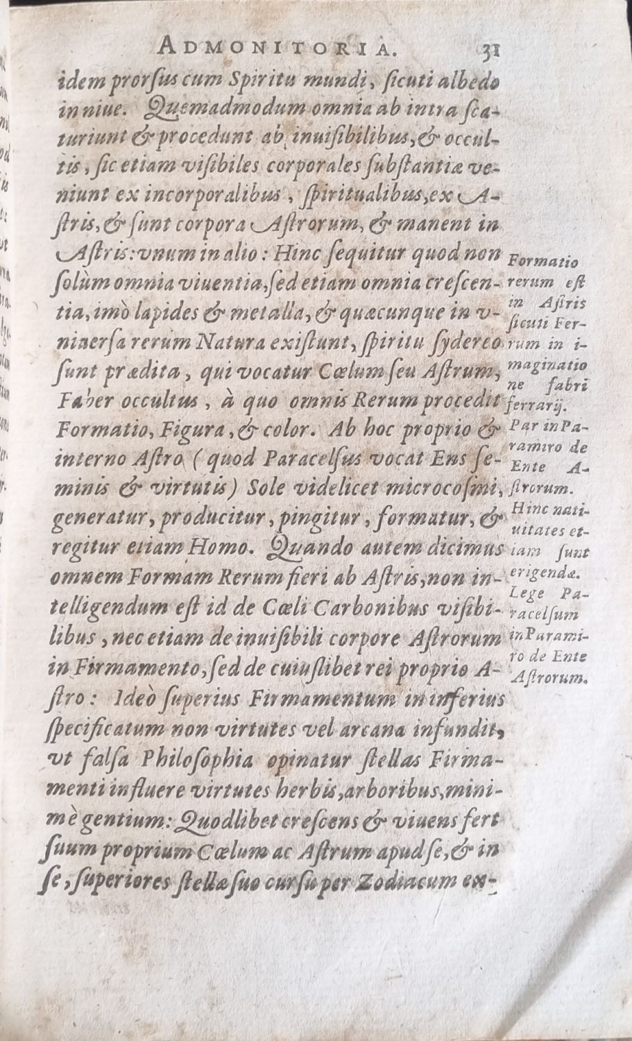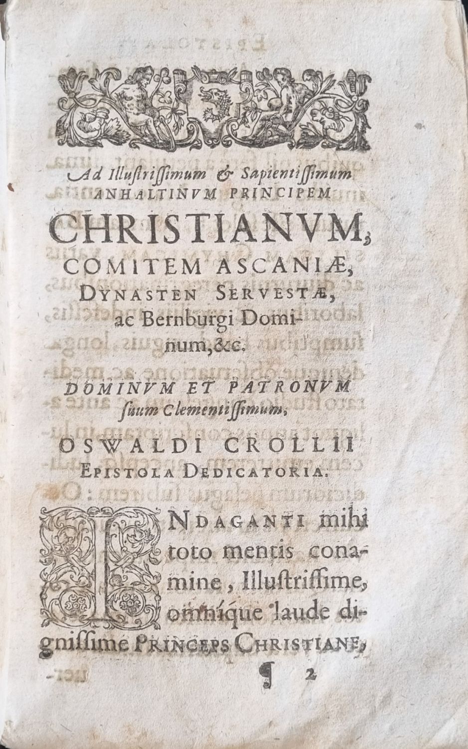 Na tit. listu viněta, konturové iniciály na rostlinném pozadí ve výši 4 řádek, pásové vlysy, živá záhlaví, tištěné poznámky po stranách. Dva mezititulní listy, na straně 313 a 318 druhé části dva drobné dřevoryty v textu, viněty. <br>Dobová pergamenová vazba, místy odřená a ohmataná, pergamen pokroucený. Papír zahnědlý, místy hnědé skvrny, při vnitřním spodním i horním okraji v části knižního bloku cestičky od červotoče.<br>Oswald Croll(cca 1563 Wetter - 25.12. 1609 Praha), německý alchymista a profesor medicíny na universitě v Marburgu. V letech 1597-1599 a pak od roku 1602 až do své smrti pobýval v Praze, kde působil v okruhu rudolfinských dvorních lékařů a zároveň v Praze působil jako vyslanec svého přítele knížete Kristiána I. z Anhaltu. Prostřednictvím Rudolfa II. navázal kontakty s dalšími alchymisty působícími tehdy v Praze, například s Edward Kelley. Jeho významné dílo "Basilica chymica" vyšlo poprvé latinsky v roce 1608. Důležitá práce z oblasti iatrochemické medicíny, autor považoval za základ medicíny harmonii mezi mikro a makrokosmem, pro svá přesná pozorování a méně tajuplné vyjadřování nabyla jeho práce většího vlivu než práce jeho vzoru, poněkud tajuplného Paracelsa.