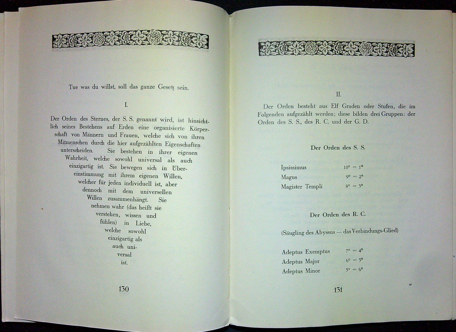 Ackermann V,939<br>Exemplář číslo 737 z neudaného počtu vydaných. V záhlaví stran pásové lišty zdobené rostlinným ornamentem, předtitul zasazený v borduře zdobené různými okultními emblémy, viněty, titulní listy jednotlivých pojednání v rámečku z ornamentů (celkem devět), na straně 93 je pojednání "Das Herz des Meisters" od Khaled Khana, ve skutečnosti od A. Crowleyho, které autor napsal roku 1924 a anglicky bylo publikováno až v roce 1938. Kniha dále obsahuje: "Liber II. Die Botschft des Meisters Therion"; "LXI vel Cause"; "Postkarten an Lehrlinge"; "Liber III vel Jugorum"; "Liber H H H sub. Figura CCCXLI"; "AHA!"; "Der Meister Therion"; "Ein Stern in Sicht" und "Kleine Mitteilungen". V úvodu díla je předmluva vydavatele A. Fra. Recnartuse (= Heinrich Tränker). - Původní kartonová vazba s barevnou ilustrací na přední straně, plátěný hřbet. Vazba lehce zaprášená. <br>Na přední straně vazby je vyznačeno Abteilung VII., Bd. 1. (ve skutečnosti se jedná o 4. svazek z 12 vydaných svazků Pansophia-Verlag). - "Collegium Pansophicum" založili roku 1921 Heinrich Tränker a Karl Germer. Heinrich Tränker (6.8. 1880 - 22.5. 1956), rosenkrucián, antikvář, okultista a teosof, vystupující pod jmény Frater Recnartus, Garuda a Henkelkreuzmann. Již za první světové války založil v Lipsku Pansofickou lóži. V roce 1925 se seznámil s Alaisterem Crowleyem, kterým byl nejprve fascinován, ale poté co se Crowley prohlásil za spasitele světa došlo mezi nimi k zásadnímu rozkolu, Crowley prohlásil Tränkera za Jidáše a Pansofická společnost byla 1. dubna roku 1926 rozpuštěna. <br>Karl Johannes Germer (22.1. 1885 Elberfeld - 25.10. 1965 West Point, Kalifornie), německý okultista, známý pod jménem Frater Saturnus. Roku 1926 odjel do USA, roku 1935 poté co mu vypršelo americké vízum, se vrátil zpět do Německa, téhož roku byl zatčen gestapem a poté vězněn v Berlíně a pak v několika koncentračních táborech. Nakonec se jeho americké manželce podařilo získat pro Germera americké vízum a ten byl roku 1941 propuštěn z tábora Gurs a odjel do USA. Germer byl po celý život podporovatelem A. Crowleyho, který ho roku 1942 jmenoval svým nástupcem v čele řádu "Ordo Templi Orientis" a po jeho smrti roku 1947 se jím stal.