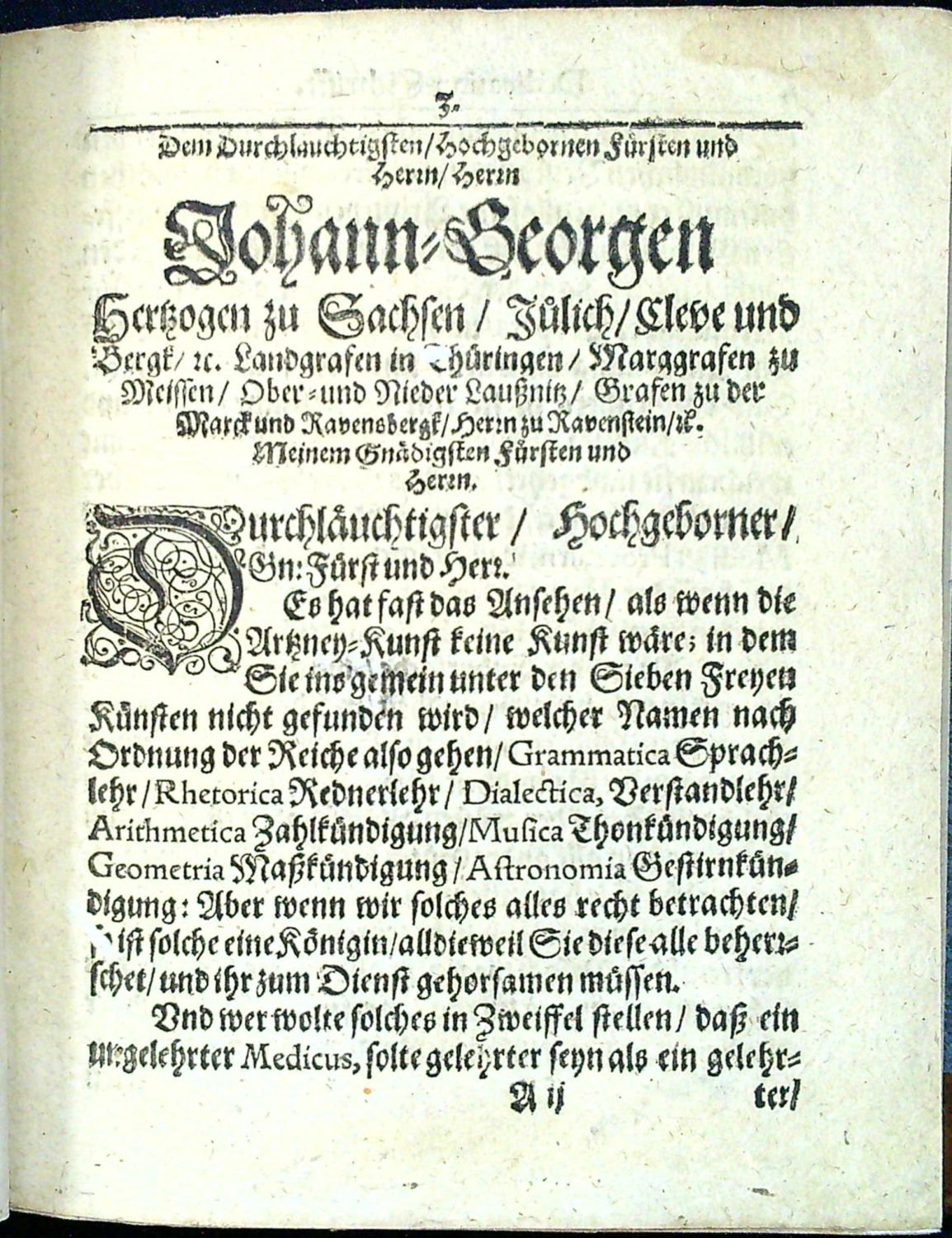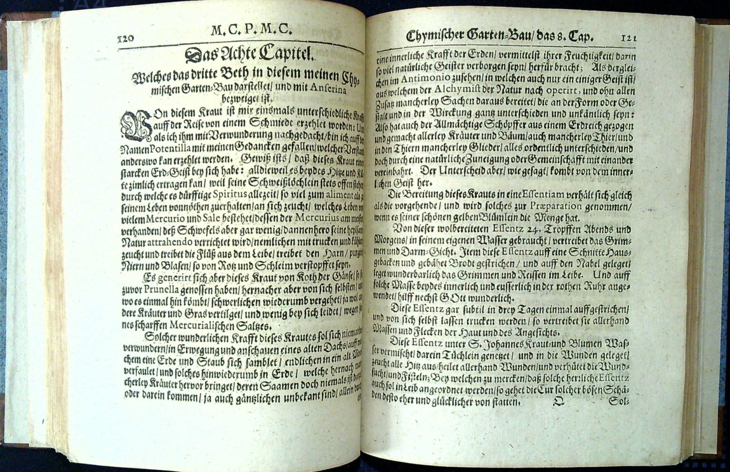 Nová kartonová vazba potažená škrobovým papírem, kožený hřbet s tmavě hnědé teletiny se třemi vazy, kožené nárožnice. Odborně a citlivě restaurováno. Na tit. listu a dalších čtyřech stranách dolity chybějící kousky papíru, titulní list mírně zašpiněn, po jeho okraji souběžně s okrajem stránky stará poznámka inkoustem, ozdobné iniciály ve výši tří řádek, na tit. listu a několika místech textu dřevořezové viněty. Ve stavu velmi dobrém.<br>Za titulním listem autorova dedikace saskému vévodovi Johannu Georgovi. První vydání vzácného hermetického spisu Michaela Crügnera, lékaře v Drážďanech.<br> Neuer Halblederband auf drei Bünden, neue Vorsätze, es fehlt Portrait-Frontispiz. Fachmännisch restauriertes Exemplar, einige Fehlstellen (meistens an den Rändern) ergänzt. Titel etwas beschmutz, mit Besitzvermerk. Gutes Exemplar dieses seltenen Werks. Erste Ausgabe einer hermetischen Schrift von Michael Crügner, der ein berühmter Dresdener Artz und Spagyriker war. Hinter dem Titel 12- seitige Widmungsschrift des Verfassers für Jahann Georg Herzog zu Sachsen. Der Verfasser entwickelte in seinen zahlreichen Werken ein System der hermetischen und spagyrischen Heilkunde und beschreibt nicht nur das Sammeln von Heilpflanzen sondern auch zahllose Therapievorschläge und mannigfaltige Rezepte für Elixiere, Essenzen usw. Ganz besonderen Wert legt Crügner auch auf astrologische Details. Die Haliographie (eigener Titel ab S. 231) ist eine Beschreibung der verschiedenen Salzmineralien, d. h. der bei Verbrennung von Pflanzenübrigbleibenden festen Stoffe.<br>Fergusson I, 189-190.