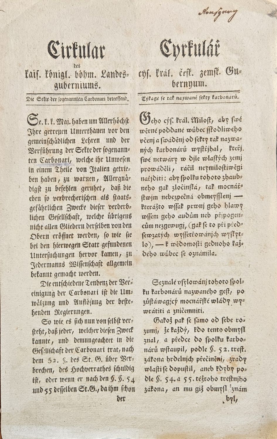 Tištěno švabachem ve dvou sloupcích, v levém text německy, v pravém česky. Na konci datace v Praze 19. listopadu 1821 a tištěné podpisy nejvyšších guberniálních úředníků Františka hraběte z Kolovrat, Petra rytíře z Mertens a Josefa Hergeta.<br>Karbonáři byla neformální skupina tajných revolučních společností působících především v Itálii v letech 1800-1831. Částečně byli ovlivněny svobodnými zednáři a ovlivnili i další revoluční skupiny mimo Itálii.