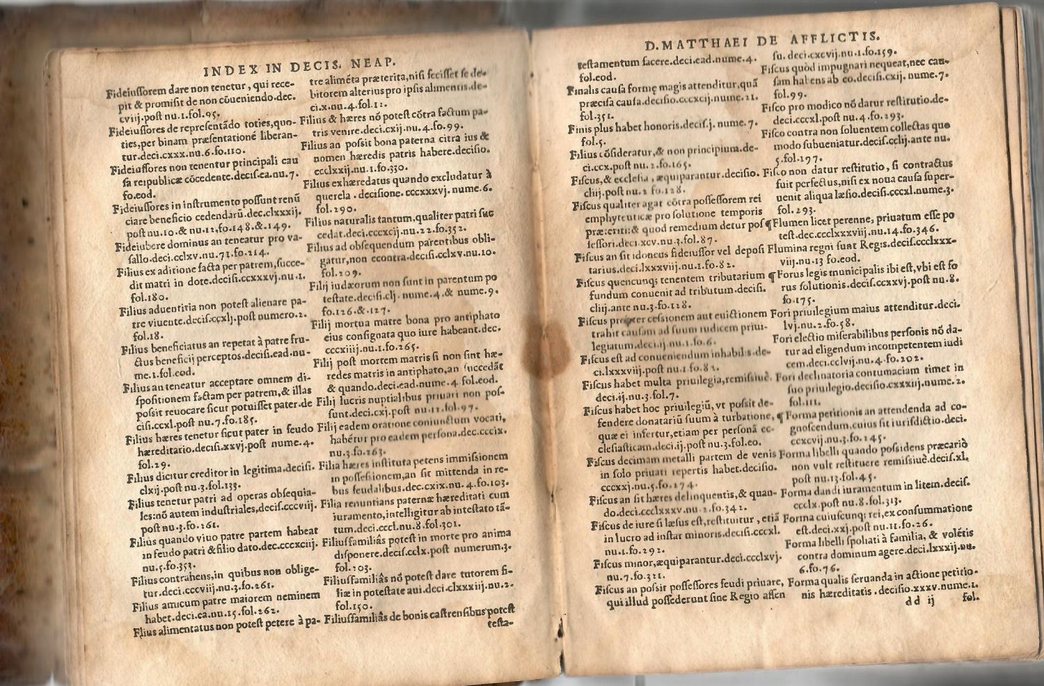 Na titulních listech viněty, sazba ve dvou sloupcích, živá záhlaví, konturové iniciály na rostlinném pozadí zalomené do výše 4-7 řádků, prvá část nepaginována, v úvodu druhé části titulní list "DECISIONES SACRI CONCILII NEAPOLITANI: A D. MATthaeo de Aflict. I.V. Doctore clarissimo, & Professore longe eminentissimo, in communem omniu studiosorum vtilitatem fructumq; summa fide ac diligentia collectae: nunc caeterum accuratius, quam vsquam antea recognitae a summis in vtraq; facultate viris, tum deniq; forma typisq; recentibus mirifice illustratae". Lugdini, Iacobi Giuntae, 1548.<br>Knižní blok v dobovém pergamenu, ve hřbetu tři vazy. Pergamen zašpiněný, zvlněný a místy potrhaný, ve hřbetu dochován pouze v horním a spodním poli. V prvé části chybí jeden list (folio cc1). Na rubu přední části pergamenové obálky starý vlastnický přípis perem. Titulní list prvé části lehce počmáraný a zašpiněný, při vnitřním okraji potrhaný, prvých 16 listů zčásti uvolněných od knižního bloku, místy hnědé a nažloutlé skvrny. <br>Matteo D´Afflitto (1447-1523), byl významný neapolský právník. Vystudoval právo na neapolské universitě, kde se v roce 1468 stal doktorem římského a kanonického práva. V letech 1495-1501 byl členem neapolské královské rady.