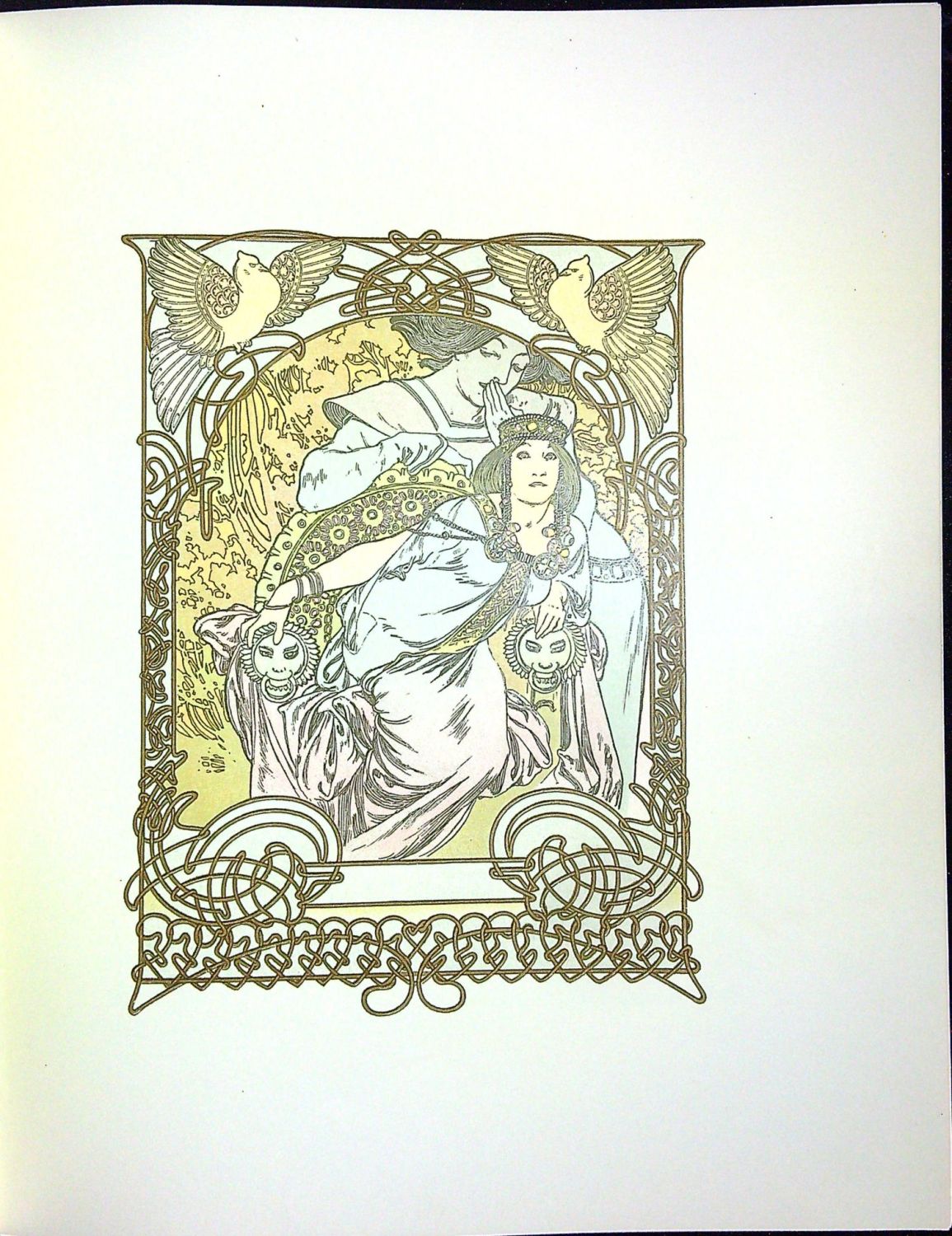 Ex. č. 381 z 800 vydaných výtisků na velínu. 134 původních litografií A. Muchy, původní litografovaná obálka, na tit. listech jednotlivých oddílů knihy Muchovy viněty, před patitulem titul v reliefu podle Muchy modelovaný Alexandrem Charpentierem, na předposledním listu suché razítko Kočího nakladatelství.<br>Původní pap. obálka, papír u horního okraje hřbetu v délce cca 3 cm natržený, , při spodním okraji hřbetu mírně roztřepený. Původní plátěné ochranné pouzdro s chlopněmi (imitace kůže) ve hřbetu mírně odřené. První vydání vyšlo ve francouzském jazyce v Paříži roku 1897, toto druhé vydání v Praze v německé a české jazykové versi.