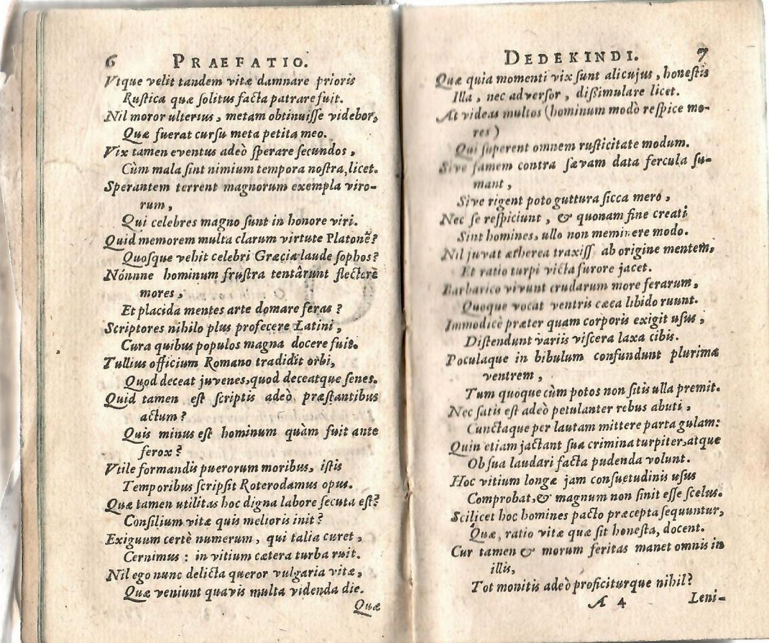 Na tit. listu dřevořezová viněta, tučně tištěné plné iniciály ve výši 2-5 řádků, živá záhlaví.<br>Friedrich Dedekind (1524 - 1598), byl německý humanista, knihkupec a protestantský kněz, jeho satira vyšla poprvé latinsky roku 1549 ve Frankfurtu nad Mohanem a poté v dalších vydáních v několika jazycích. Česky vyšla porvé roku 1647 v Litomyšli a pak ještě v několika vydáních po polovině 18. století.<br> + 1. přívazek (tři Kornmannovy práce): Kornmann, Henric "Sibylla Trig-Andriana Seu de VIRGINITATE, VIRGINUM STATU Et Jure TRACTATUS NOVUS Et Iucundus: Ex Jure Naturali, Divino, Canonico & Civili, Scriptoribus Ecclesiasticis & Prophanis, in gratiam Physicorum, Medicorum, Theologorum, & Juridicorum, paratus". "LINEA AMORIS sive COMMENTARIUS In Versiculum Glossae, Visus, Colloquium, Convictus, Oscula, Factum ...". "DE ANNULO TRIPLICI: USITATO, SPONSALITIO, SIGNATORIO: Tractatus absolutissimus, in ters partes divisus". Hagae-Comitum (Haag), Adrian Vlacq, 1654, [XXIV]-214-117-[III]-69-[III] stran, na tit. listech drobné dřevořezové vinětky, pásové vlysy z ornamentů, konturové iniciály na rostlinném pozadí ve výši 4-5 řádků, tučně tištěné versálky ve výši 2-3 řádků, živá záhlaví.<br>Heinrich Kornmann (1579 Kirchhein - 1628 Kirchhein), německý právník, studoval v Marburgu a poté v Římě, kde získal titul doktora obojího práva. Ve svých traktátech se autor odvolává na řadu pramenů, včetně klasických autorů a děl církevních otců. Do jisté míry hájí práva žen, ale též opakuje řadu různých pověr. Pojednává též o inkubech a sukubech, astrologii, barvě ženských oděvů a jejich významu, ... V prvním traktátu se zabývá právy a povinnostmi žen a jejich chováním v sexuálních záležitostech, v dalším o pěti fázích lásky (pohled, rozhovor, fyzický kontakt, líbání a vyvrcholení), ve třetím prstenům (včetně zásnubních) a jejich významu. Prvé dva traktáty vyšly poprvé ve Frankfurtu nad Mohanem roku 1610.<br>+ 2. přívazek: Hanotel, Philipp "MUNDI STULTITIA COMPENDIO demonstranta Opera ....". Bruxell, Francisci Foppens, 1655, 110-[VII] stran, na tit. listu dřevořezová viněta, koncová viněta, konturové iniciály na rostlinném pozadí zalomené do výše 7 řádek, živá záhlaví. <br>Philippe Hanotel (1600-1637), jesuitský teolog.<br>Dobová pergamenová vazba, ohmataná a zašpiněná, při spodním okraji přední desky mírně okousaná, při horním okraji hřbetu inkoustem psaný název, ve spodní části hřbetu chybí část pergamenového pokryvu. Na předním vakátu rkp. provenienční přípis z roku 1803 "Franz Anton Czerny", na tit. listu stará poznámka perem, na jeho rubu prov. přípis "Ex Bibliotheca Conventus Pragensis ordinis ....". Papír místy zahnědlý, několik posledních listů při vnějším okraji lehce pomačkaných.