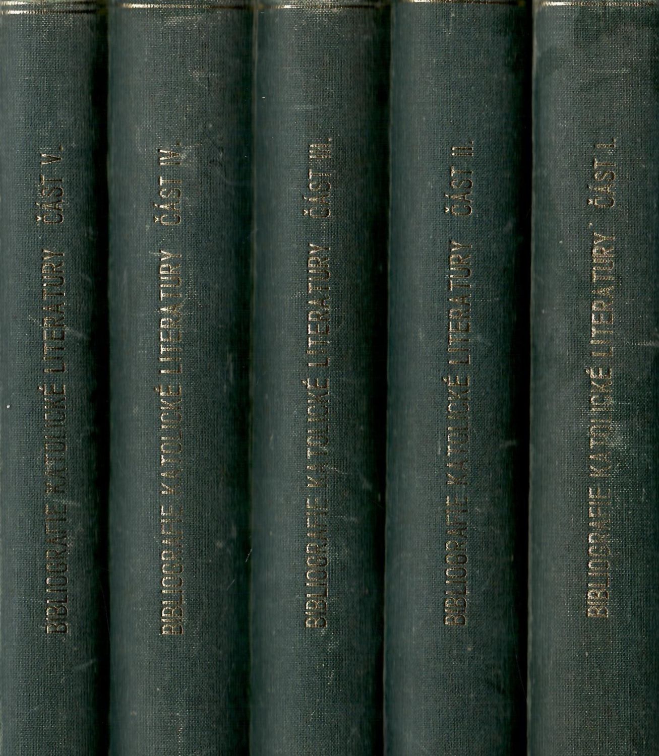 Původní pap. obálky vevázány, temně zelená plátěná vazba, ve hřbetech tlačené a zlacené názvy s označením jednotlivých dílů, barvené ořízky. Vazby místy lehce odřené, naražené rohy. - Kompletní exemplář nejobsáhlejší bibliografie české katolické literatury z let 1828 až 1913.
