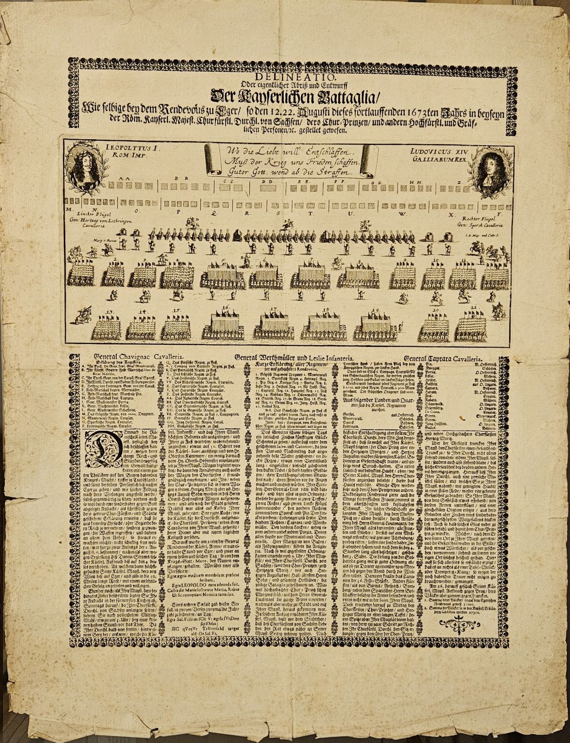 DELINEATIO, Oder eigentlicher Abriss und Entwurff. Der Kayserlichen Battaglia Wie selbige bey dem Rendevous zu Eger, so den 12. 22. Augusti dieses fortlauffenden 1673ten Jahrs in bey seyn der Rom. Kayserl. Majest. Durchl. von Sachsen, dero Chur-Printzen, und andern Hochfürstl. und Gräflichen Personen, etc. gestellet gewesen.