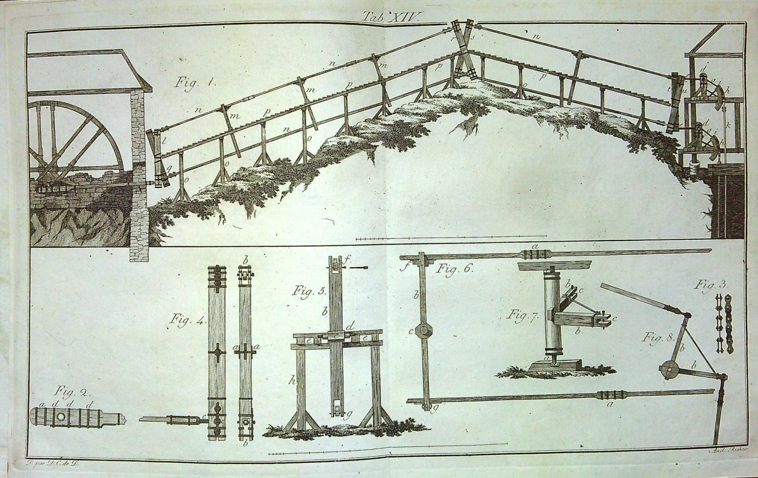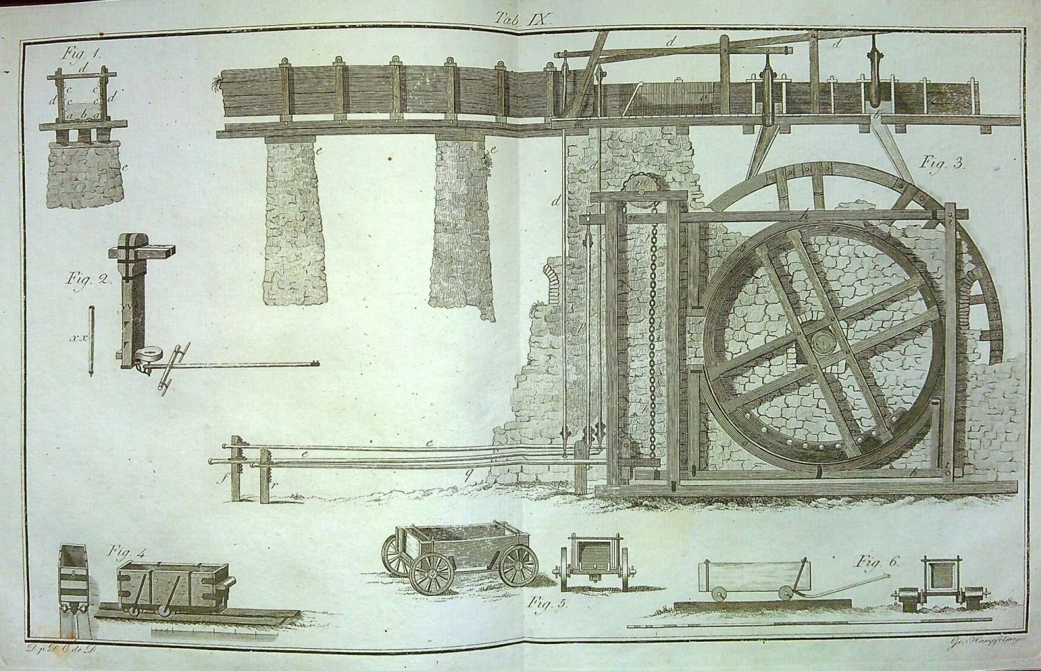 Poggendorf I,544<br>Nabízené rytiny byly součástí díla "Anleitung zu der Bergbaukunst nach ihrer Theorie und Ausübung, nebst einer Abhandlung von den Grundsätzen der Berg= Kammeralwissenschaft, für die Kaiserl. Königl. Schemnitzer Bergakademie entworfen, von Christoph Traugott Delius". Textový díl chybí. <br>Dobová kožená vazba, hřbet dělený na jednotlivá pole tlačenou a zlacenou ozdobnou lištou, ve 2. a 4. poli dobové temně zelené kožené štítky s tlačeným a zlaceným názvem, přes první pole přelepen pap. knih. štítek, na rubu první rytiny staré rozmazané razítko "Przybramer K. K. ? bibliothek". Vazba místy lehce odřená, chybí kousky zelených štítků na hřbetu. Rytiny v krásném sytém stavu. Rozměr vazby 247 x 225 mm, rozměr celého papíru s rytinami 240 x 385 mm.<br>Christoph Traugott Delius (1728 Wallhausen - 1779 Florencie), byl německý báňský vědec. Působil jako profesor na báňské akademii v Bánské Štiavnici. Nabízené tabule byly součástí díla, která bylo první vysokoškolskou učebnicí o hornictví a bylo hojně využíváno po celém světě takřka po dvě století.