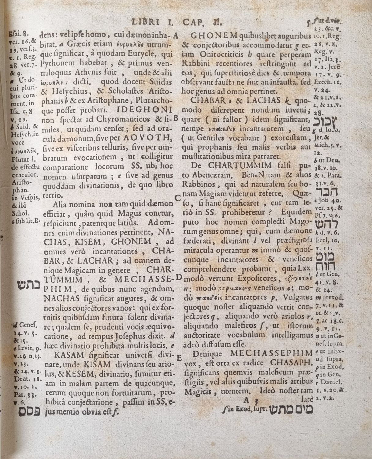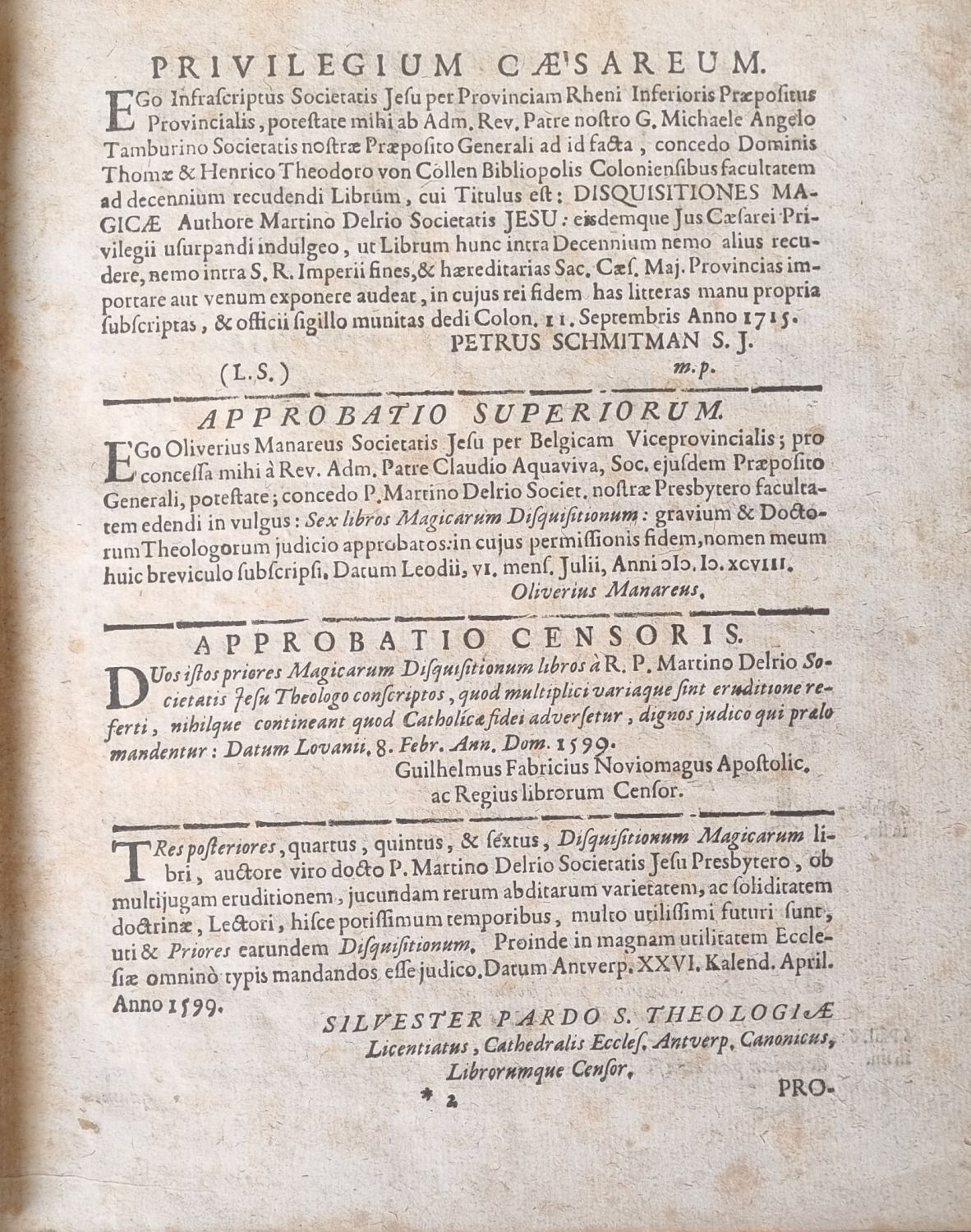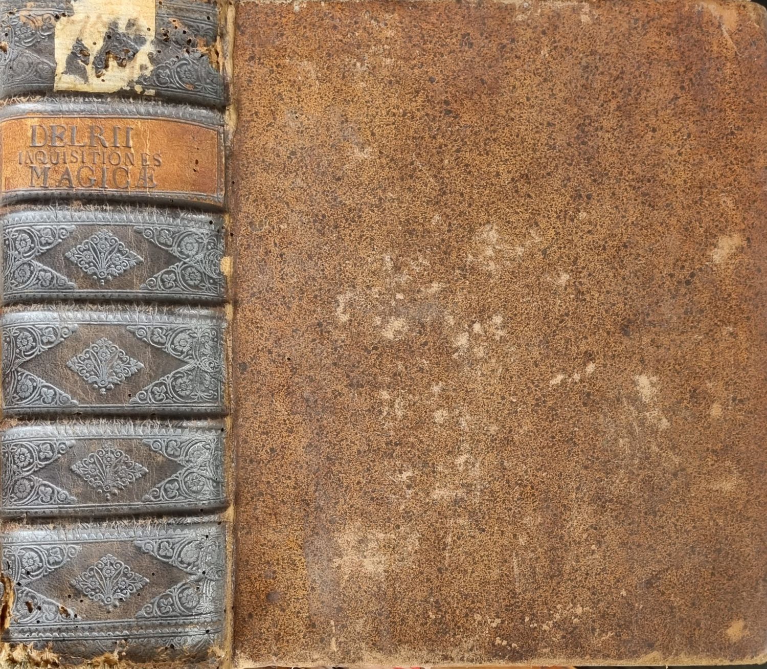 Červeno-černě tištěný titulní list, živá záhlaví, tištěné poznámky po stranách, sazba ve dvou sloupcích, tučně tištěné versálky ve výši 2-5 řádků, viněty, na str. 366 konturová iniciála na ornamentálním pozadí zalomená do výše 6 řádků, pásové lišty a ryče z rostlinného ornamentu. <br>Dobová vazba z temně hnědé hověziny, ve hřbetu 5 vazů, ve druhém poli světlý kožený štítek s tlačeným názvem, v ostatních polích tlačený ornament. Vazba ohmataná a místy lehce odřená, při horním okraji hřbetu torso starého pap. knih. štítku. Při horním okraji hřbetu kůže natržená a na několika místech proděravělá od červotoče, při spodním okraji hřbetu kůže okousaná. Papír místy zahnědlý, na zadním přídeští v rozích cestičky od červotoče, lehce naražené rohy.<br>Martin Anton Delrio (17.5. 1551 Antverpy - 19.10. 1608 Leuven), nizozemský jesuitský teolog a právník, přítel vlámského humanisty Justuse Lipsia. Nabízené dílo je jeho nejslavnější knihou, poprvé vyšla v letech 1599-1600 v Lovani a pojednává o magii, čarodějnictví a různých pověrách.