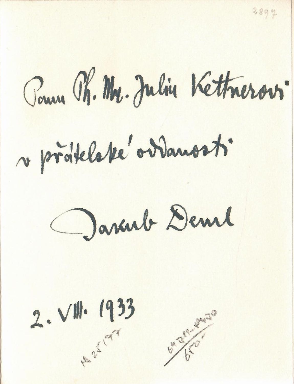Ve front. světlotiskem reprodukovaný fotograf. portrét P. Kytlicové. Na Zandersově velínovém papíře vytisklo Družstvo knihtiskárny v Hranicích na Moravě. - Na přední předsádce rkp. dedikace autorova "Panu Ph. Mr. Julii Kettnerovi v přátelské oddanosti Jakub Deml 2.VIII. 1933".