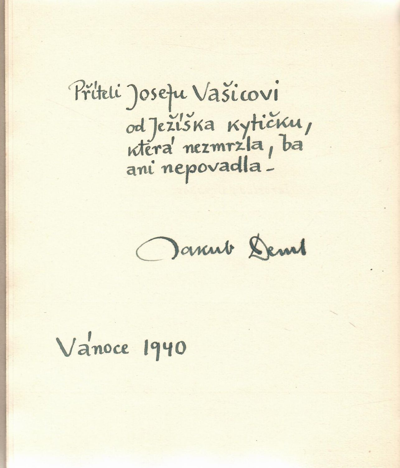 Ex. č. V z 200 vydaných a tištěných písmem Baskerville na ruční papír Old Holland, graficky upravil K. Svolinský a rytiny vytiskl Mirro Pegrassi. <br>Původní pap. obálka s chlopněmi, knižní blok nerozřezaný, v tiráži podpisy Demla a Svolinského. Na rubu tištěné dedikace Jaroslavu Bryndovi rukopisná dedikace černým perem autorova "Příteli Josefu Vašicovi od Ježíška Kytičku, která nezmrzla, ba ani nepovadla - Jakub Deml Vánoce 1940".