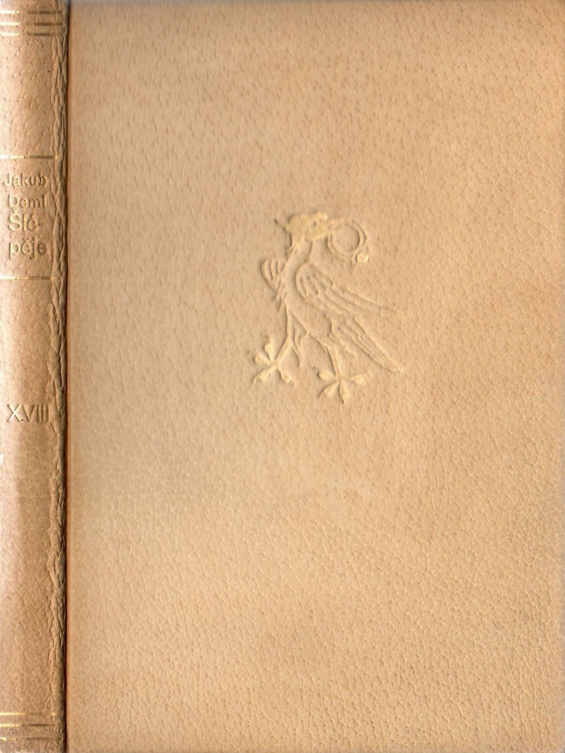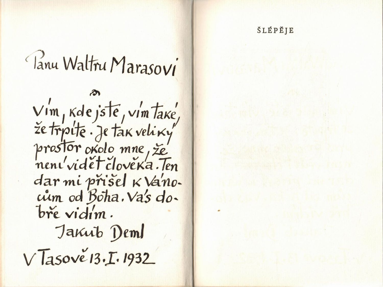 Tištěno na ručním rýhovaném papíře, dvoubarevně tištěný tit. list s vinětou. Na rubu předního vakátu autorova dedikace černým perem "Panu Waltru Marasovi. Vím, kde jste, vím také, že trpíte. Je tak veliký prostor okolo mne, že není vidět člověka. Ten dar mi přišel k Vánocům od Boha. Vás dobře vidím Jakub Deml v Tasově 13.I. 1932". - Individuální vazba ze světlé hlazené vepřovice, na přední desce tlačený a zlacený obrys ptáčka s prstýnkem v zobáku. Ve hřbetu jednoduché linky a tlačený a zlacený název, zlacená svrchní ořízka.