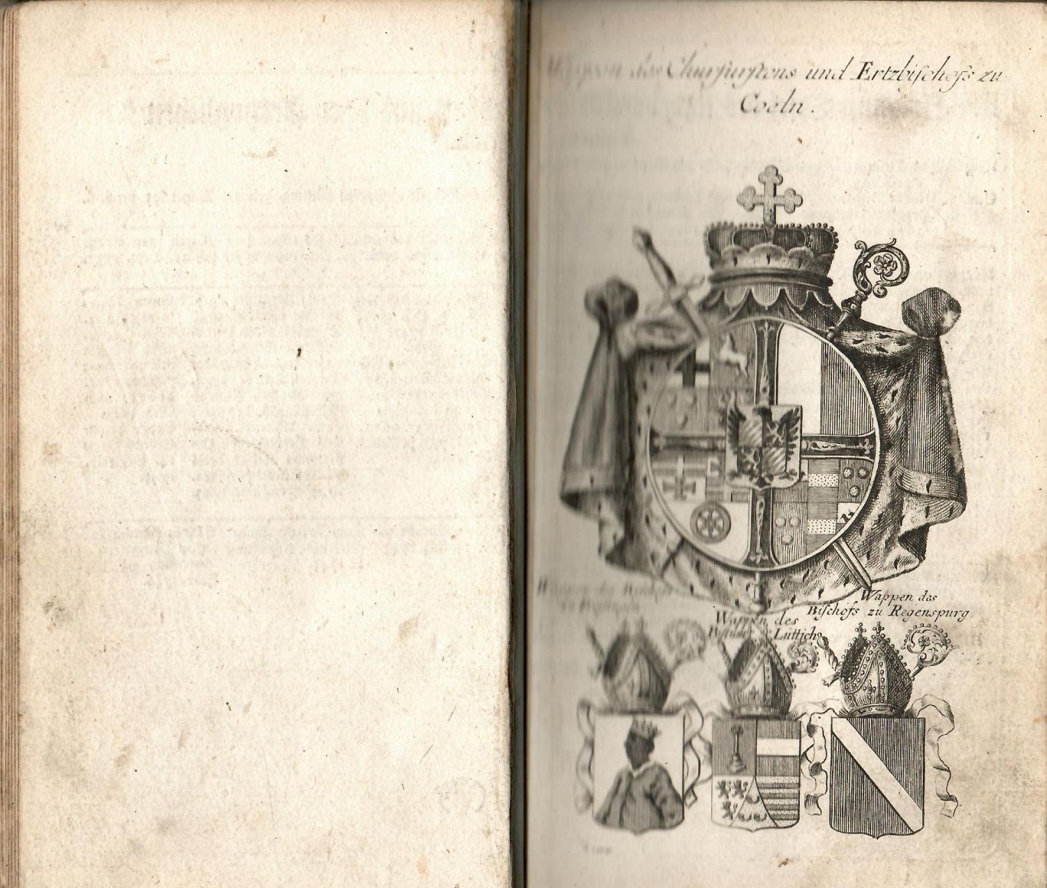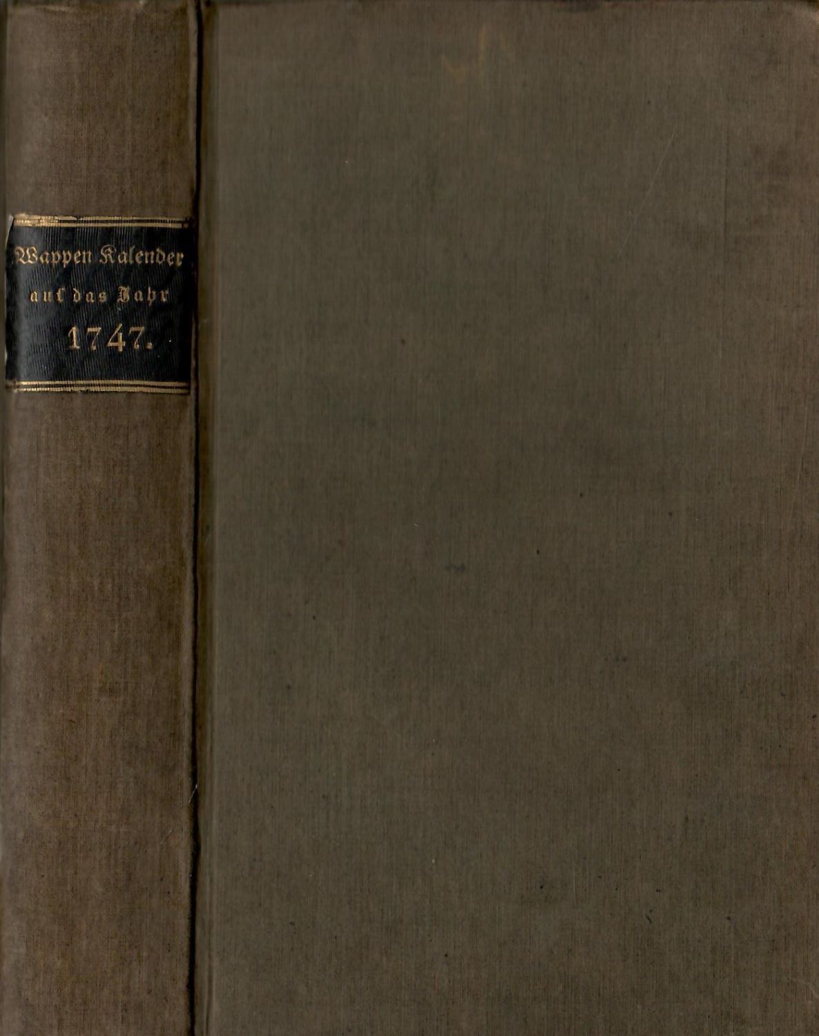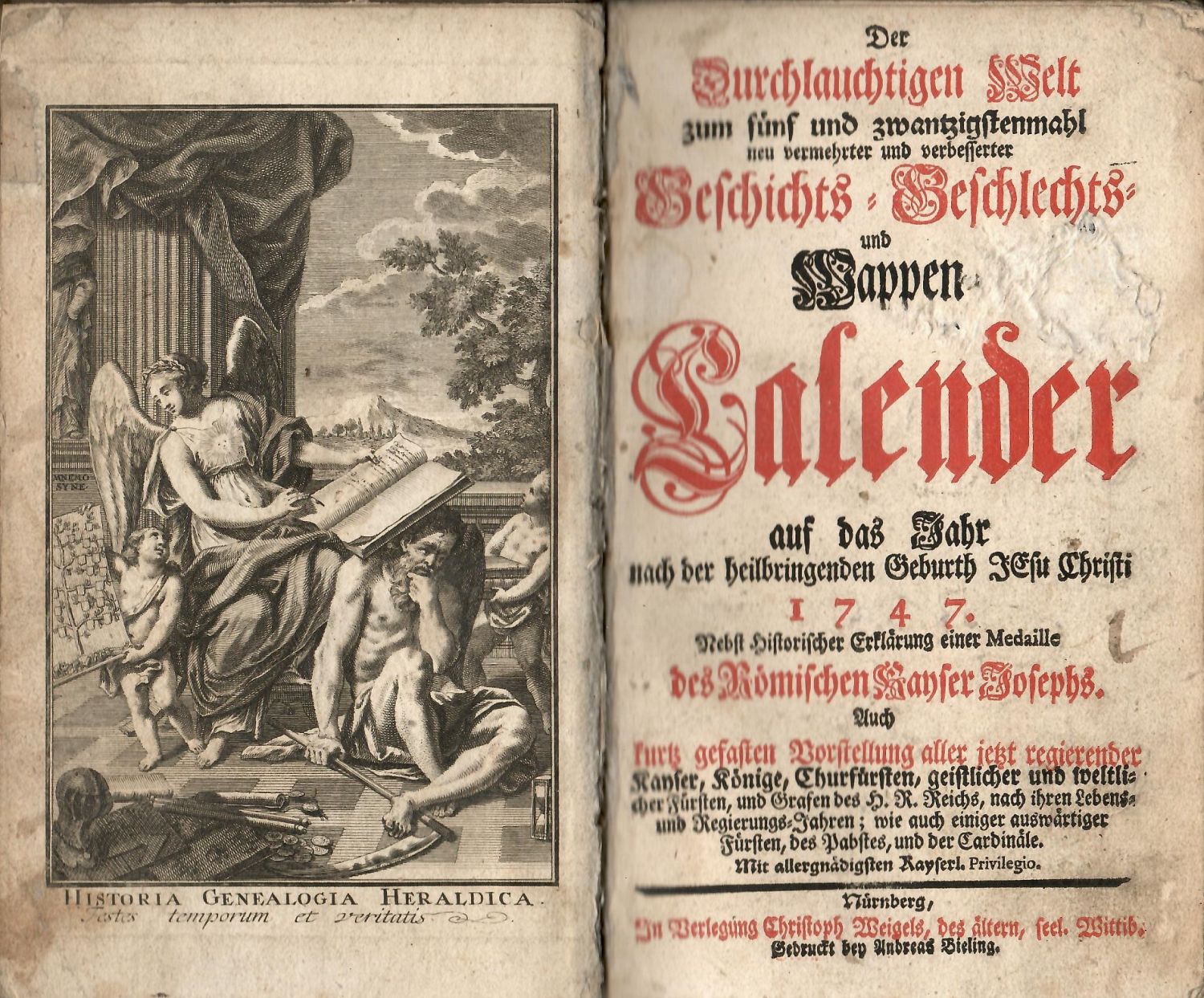 Der Durchlauchtigen Welt zum fünf und zwantzigstenmahl neu vermehrter und verbesserter Geschichts = Geschlechts = und Wappen=Calender auf das Jahr nach der heilbringenden Geburth JEsu Christi 1747. Nebst historischer Erklärung eines einer Medaille des Römischen Kayser Josephs. Auch kurtz gefasten Vorstellung aller jetzt regierender Kayser, Könige, Churfürsten, geistlicher und weltlicher Fürsten, und Grafen des H. R. Reichs, nach ihren Lebens= und Regierungs=Jahren; wie auch einiger auswärtiger Fürsten, des Pabstes, und die Cardinäle. Mit allergnädigsten Kayserl. Privilegio.