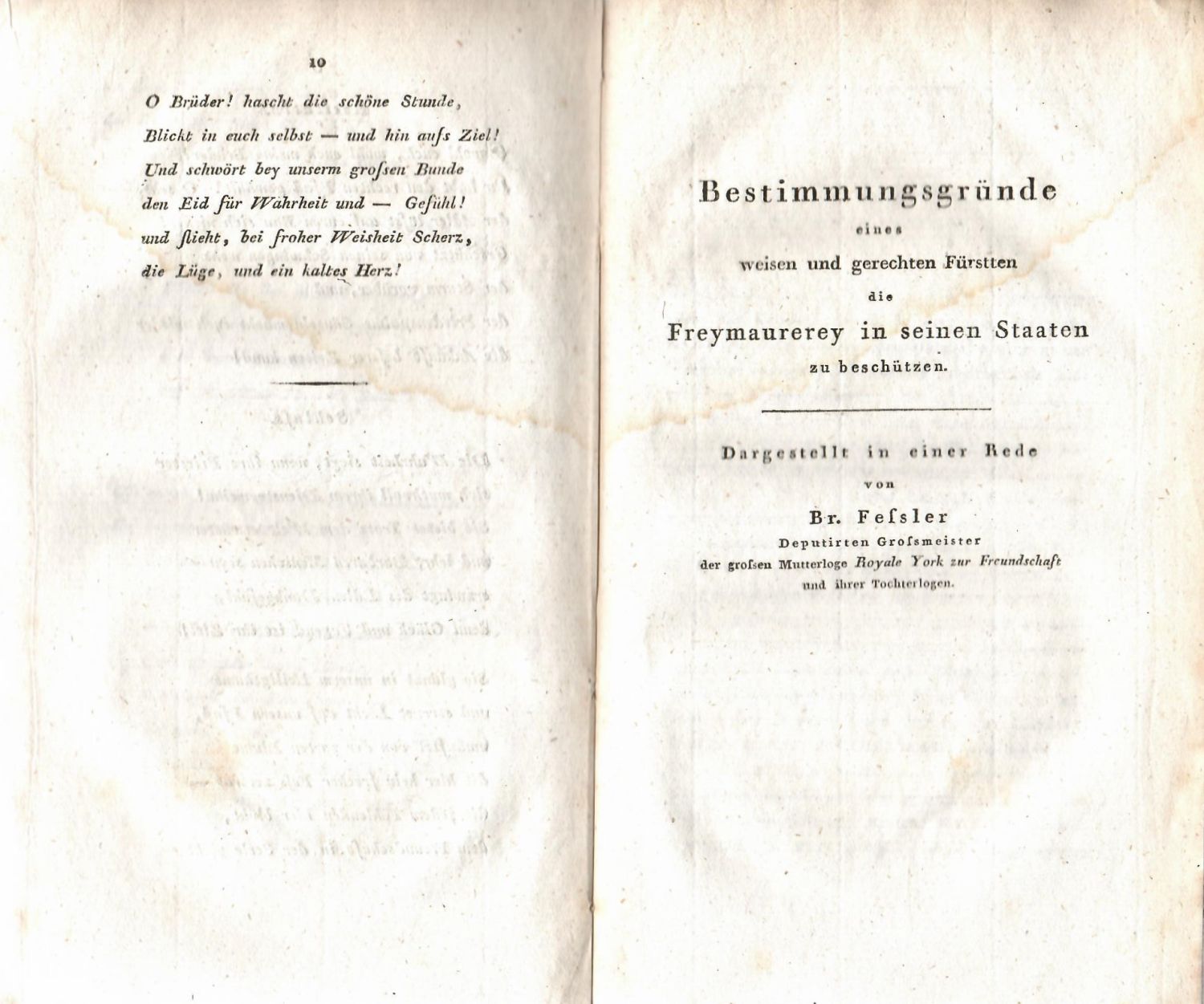 Wolfstieg 940<br>Tištěno antikvou, kantáta v úvodu pokurzivou, tištěné poznámky pod čarou.<br>Dobová obálka z modře barveného papíru, při horním okraji hřbetu chybí v délce cca 3 cm pap. pokryv obálky, přes hřbet přelepeny dva staré pap. knih. štítky, pap. obálky lehce zašpiněný a mírně zvlněný. Na předním přídeští rkp. provenience z 19. století a na tit. listu staré razítko zednářské lóže "Archimedes .." v Altenburgu. Místy drobné hnědé flíčky způsobené kyselostí papíru, při horním vnitřním okraji papír mírně zvlněný, oslí uši. - V nabízené práci jsou mimo jiné na straně 55-72 vypsané dějiny berlínské zednářské lóže "Royale York" a v závěru seznam členů lóže.