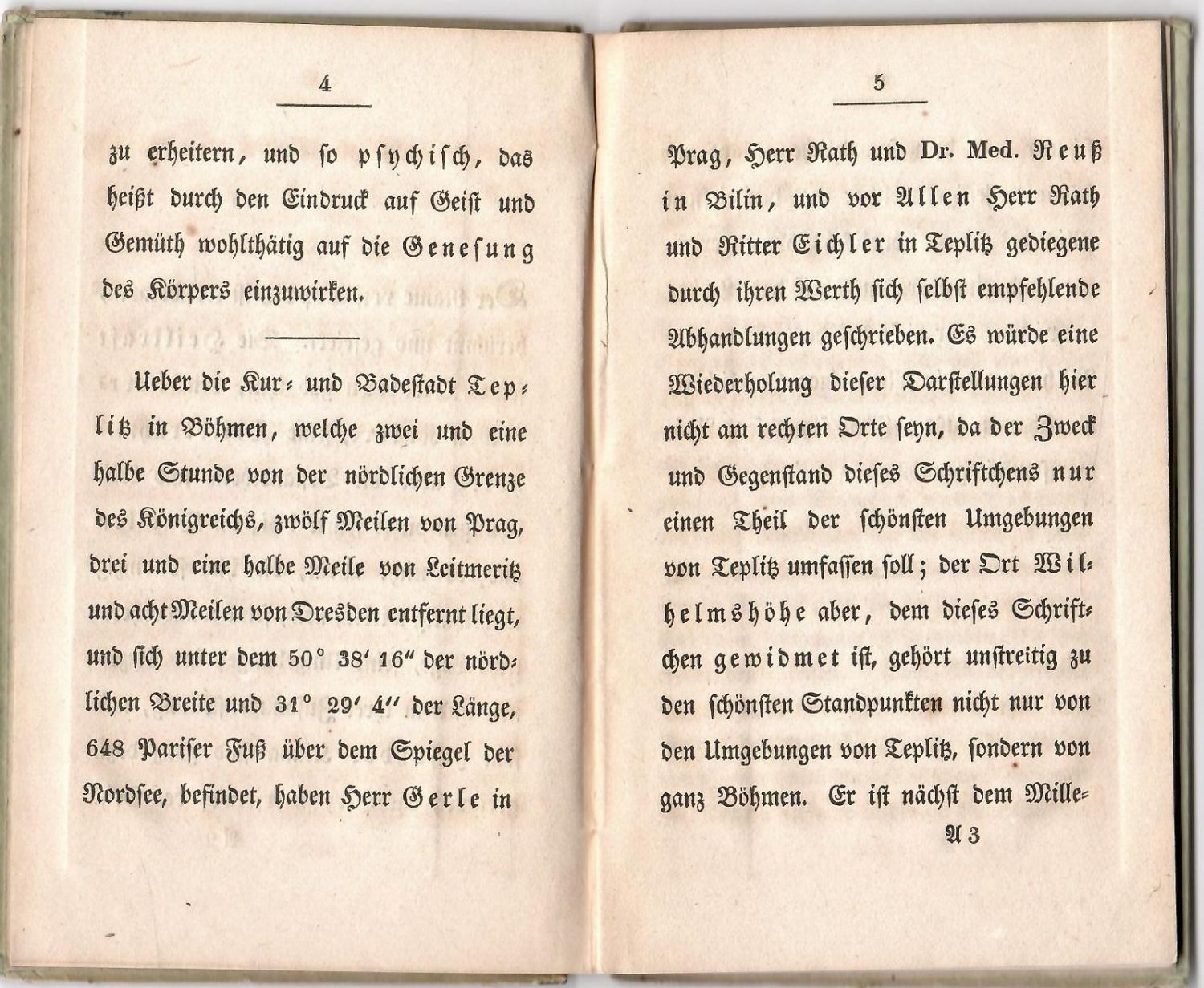 Gotika, signatury, tištěné poznámky pod čarou, arabská paginace stran uprostřed horního okraje nad mizící linkou. Ve frontispisu rozkládací ocelorytina s pohledem na Vilémovu výšinu a budovou mlýna na jejím úpatí, rytinu vyryl C. Tschuppik a vytiskl C. W. Medau.<br>Původní kartonová vazba, na přední desce v ornamentálním rámu název, na zadní viněta. Ve hřbetu chybí pap. pokryv, na tit. listu perem jméno jednoho z prvních vlastníků knížky.<br>Stručný popis v minulosti oblíbeného turistického místa "Vilémovy výšiny" nad městem Krupka v Krušných Horách a jejího blízkého okolí. Na jejím vrcholu se nacházel osmiboký altán a restaurace. Místo se původně nazývalo "Mlýnský vrch", protože pod úpatím u potoka stávaly tři mlýny. Po návštěvě pruského krále Fridricha Wilhelma III. bylo přejmenováno.<br>Ewald Christian Victorin Dietrich (19.7. 1785 Grünhayn - 1.1. 1832 Leipzig), byl německý spisovatel a lékař. Několikrát pobýval jako lázeňský host v Karlových Varech a Teplicích, kde během svého pobytu napsal nabízeného stručného průvodce, který tiskem vyšel až po jeho smrti. Souborný katalog knih ČR eviduje ve státních sbírkách 3 exempláře.