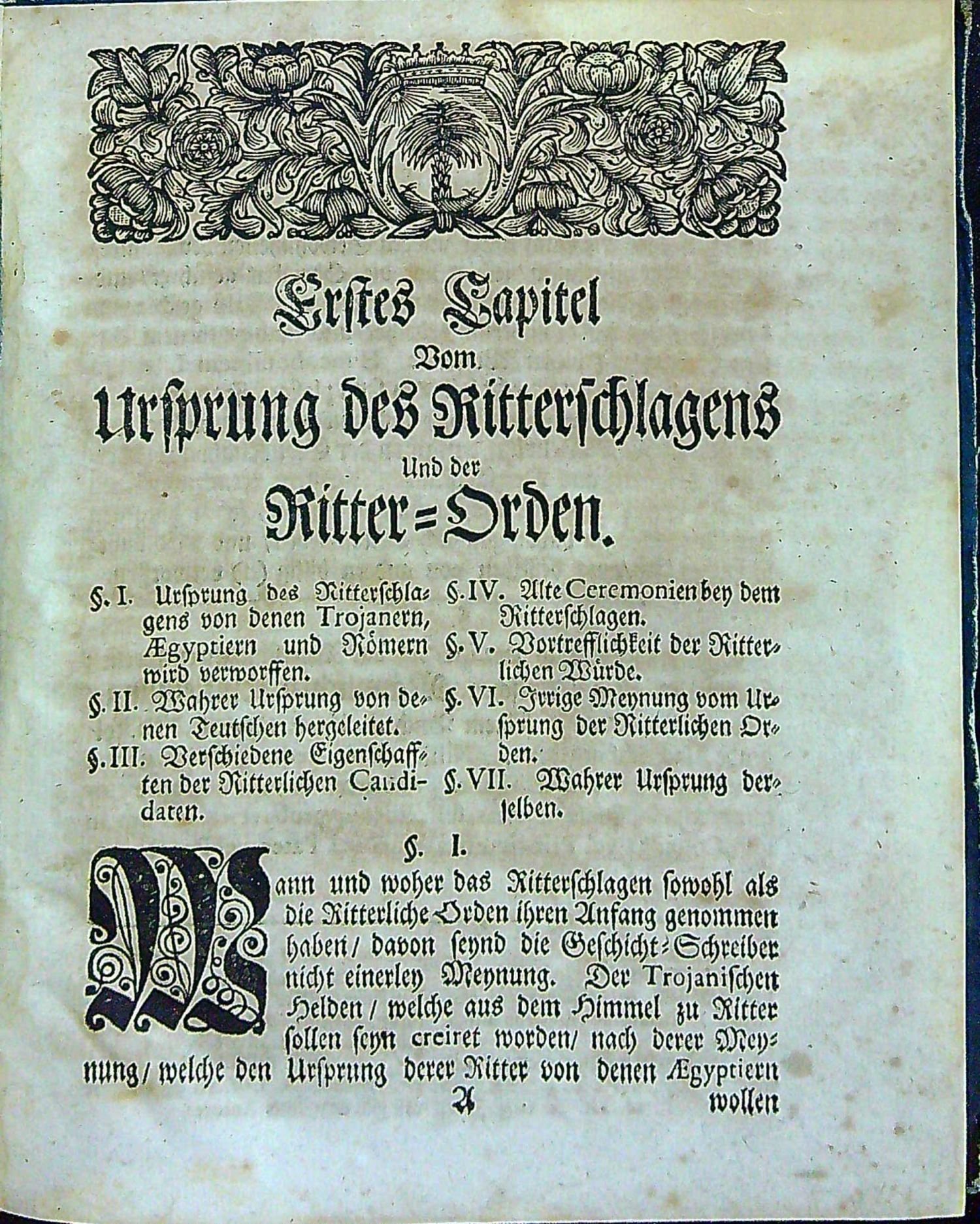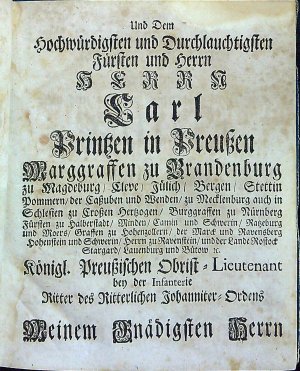 Geschichte Des Ritterlichen Johanniter=Orden Und dessen Herren=Meistertmums In der Marck/ Sachsen/ Pommern und Wendland Worinn des am VII. April dieses Jahrs gehaltenen Ritter=Schlags SOLENNITAETEN Verzeichniss der investirten Ritter und derselben Stamm=Wappen wie auch Ursprung des Ritterschlagens und Ritterlichen Orden Anmerckungen von Orden=Creutz Herrn Abt de Vertot ins Teutsche übersetzte Dissertation vom alten und neuen Gouvernement des Johanniter=Ordens enthalten und beschrieben Von Justus Christoph Dithmar.