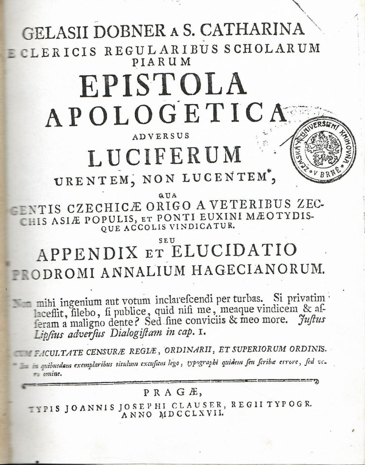 Epistola apologetica adversus Luciferum urentem, non lucentem, qua gentis Czechicae origo a veteribus Zecchis Asiae populis, et Ponti Euxini Maetodisque accolis vindicatur. Seu appendix et elucidatio Prodromi Annalium Hagecianorum. ...