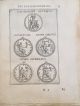 Mědirytinový frontispis, na tit. listu do mědi rytá viněta, v textu 207 mědirytin s vyobrazením 483 antických mincí a medailí, 41 mědiryt. ilustrací a 17 celostr. mědirytin (se 70 vyobrazeními mincí a medailí a 5 vyobrazeními antických chrámů a náboženských obřadů. Iniciály na dřevořezovém ilustr. pozadí ve výši 6 řádků, vstupní pásový vlys, tučně tištěné versálky, tištěné poznámky po stranách, na několika místech v textu versálkami přetištěné nápisy z antické doby.