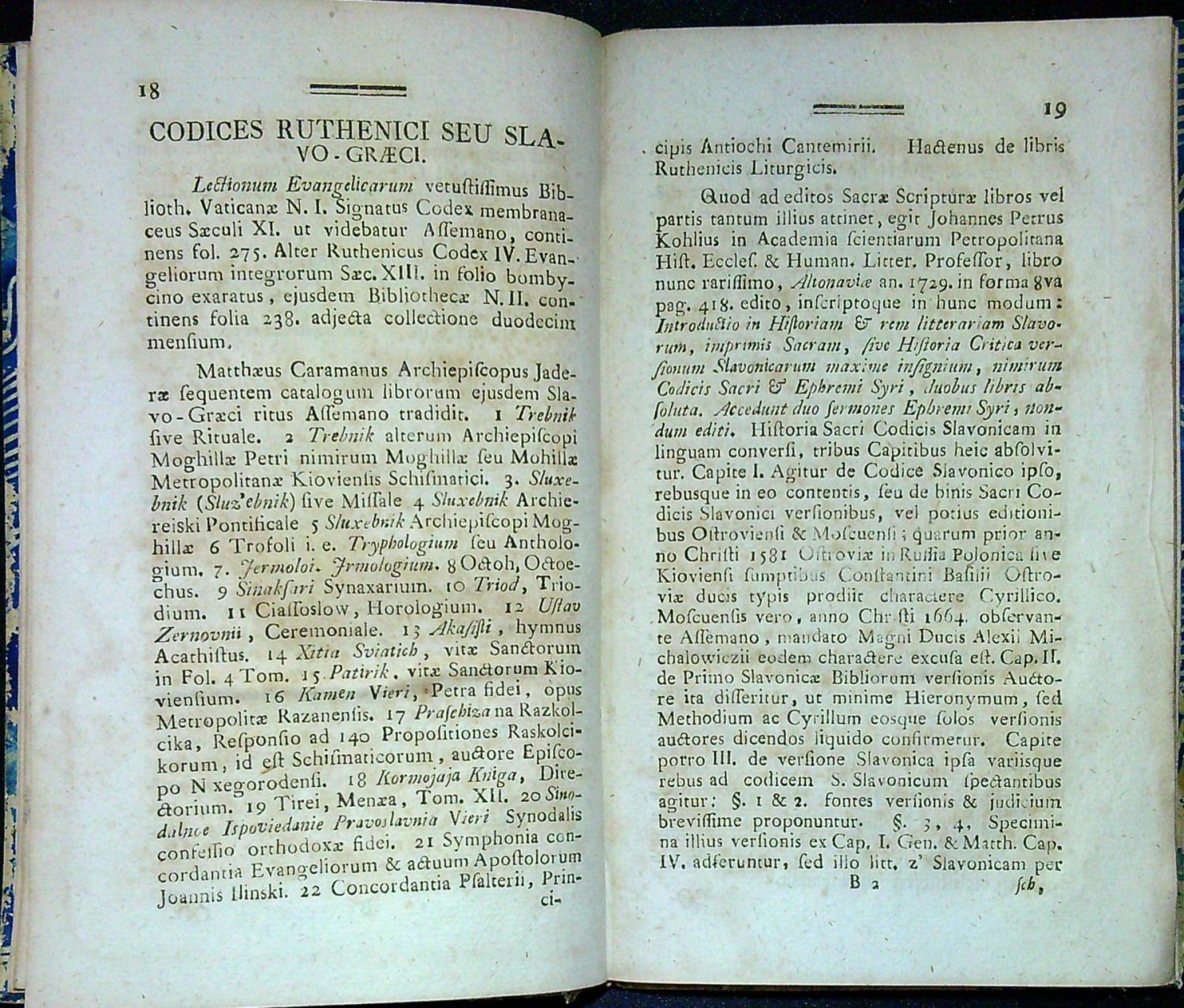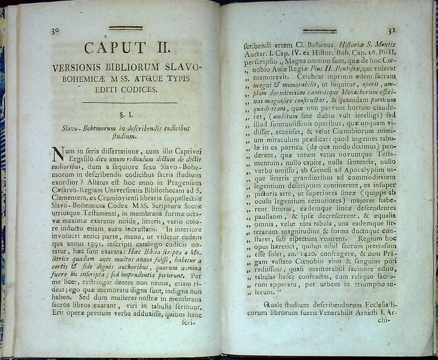 Knihopis 2146; Pumprla I,2146<br> Latinský text antikvou, místy kursivou, český kursivou, stránkové kustody, uprostřed horního okraje stran krátká dvoulinka, paragrafy, tučně tištěné versálky ve výši 2 řádků, vstupní dřevořezový vlys, na tit. straně mědiryt s postavami sv Cyrila a Metoděje držícími kostel, na str. 29 a 47drobné dřevořezové viněty, koncová ozdobná tyč. Za stranou 56 (chybně paginovanou 42) na 4 listech "POSITIONES EX VETERIS TESTAMENTI PHILOLOGIA et HERMENRUTICA SELECTAE QUAS PROPUGNABIT REL. F. CYRILLUS TAMON....", na druhém listu v záhlaví rokokový vlys s puttim držícím rozevřenou knihu, uprostřed horních okrajů stran tři drobné tiskařské ozdůbky, koncová vinětka.<br>Dobová kartonová vazba potažená mramorovaným papírem, ve hřbetu pap. pokryv z větší části chybí, desky místy odřené a zvlněné. <br>Václav Michael Durych (1735-1802), řeholním jménem Fortunát, člen paulánského řádu, profesor hebrejštiny a řečtiny na pražské universitě, několikanásobný spolurektor a provinciální vikář, zakladatel české slavistiky, blízký přítel M.A. Voigta, F.M. Pelcla a J. Dobrovského. Nabízená publikace je prvním pokusem o popis nejstarších staroslověnských rukopisů uložených ve Vatikánské knihovně, základ Durychova nejslavnějšího díla "Bibliotheca Slavica", vydaného v roce 1795.<br/> Václav Michael Durych (Ordensname Fortunat), böhmischer Paulaner und Orientalist, Professor der hebräischen und griechischen Sprache, Begründer der böhmische Slawistik. Vorliegendes Werk ist ein Versuch über die Beschreibung der ältesten altkirchenslawischen Handschriften aus der Vatikanischer Bibliothek. Im Jahre 1795 gab er sein berühmtes Werk "Bibliotheca Slavica" heraus.