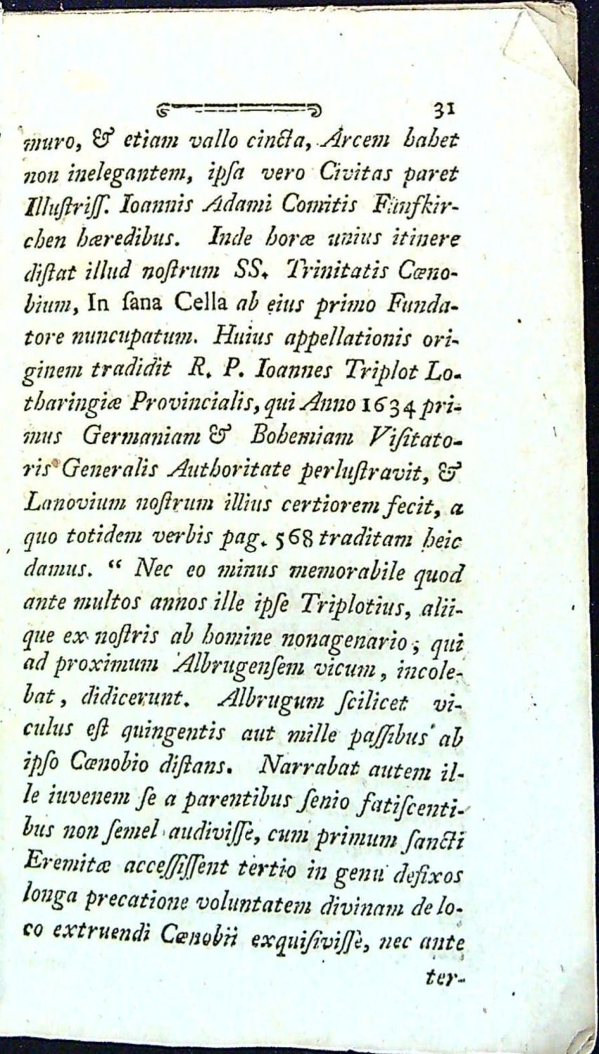 Knihopis 2147; Zíbrt IV/2326;- přívazek BCBT29013; Pumprla VI/3100. <br/> Chybí frontispis a dvě mědirytinové přílohy. Na str. 7 mědirytina v ozdobném rámci s girlandami (pamětní medaile z r. 1611). Na titulním listu a rubu obálky provenienční záznamy inkoustem, u tit. listu utržen pravý horní růžek. <br> V. F. Durych (1735-1802), člen řádu paulánů, působil v Tachově, Mnichově a Praze, tři roky byl provinciálním vikářem. Filolog, slavista a orientalista, zakladatel odborného slavistického studia v Čechách. Zabýval se především církevně-slovanským jazykem a literaturou a staročeskými překlady bible. <br/> přívazek: Monumenta probationum desumpta ex tabulario Pragensi FF. Minimorum. [bez místa (Praha), nakladatele, roku (1771)]. 58 (recte 56) strna straně 49 (nečíslované) mezititul "POSITIONES EX VNIVERSA THEOLOGIA QVAS PVBLICE PROPVGNENDAS SVSCEPIT V. P. ROCHVS SCHADEK ....". Uprostřed horního okraje stran mizící ozdobná tyč, viněty.