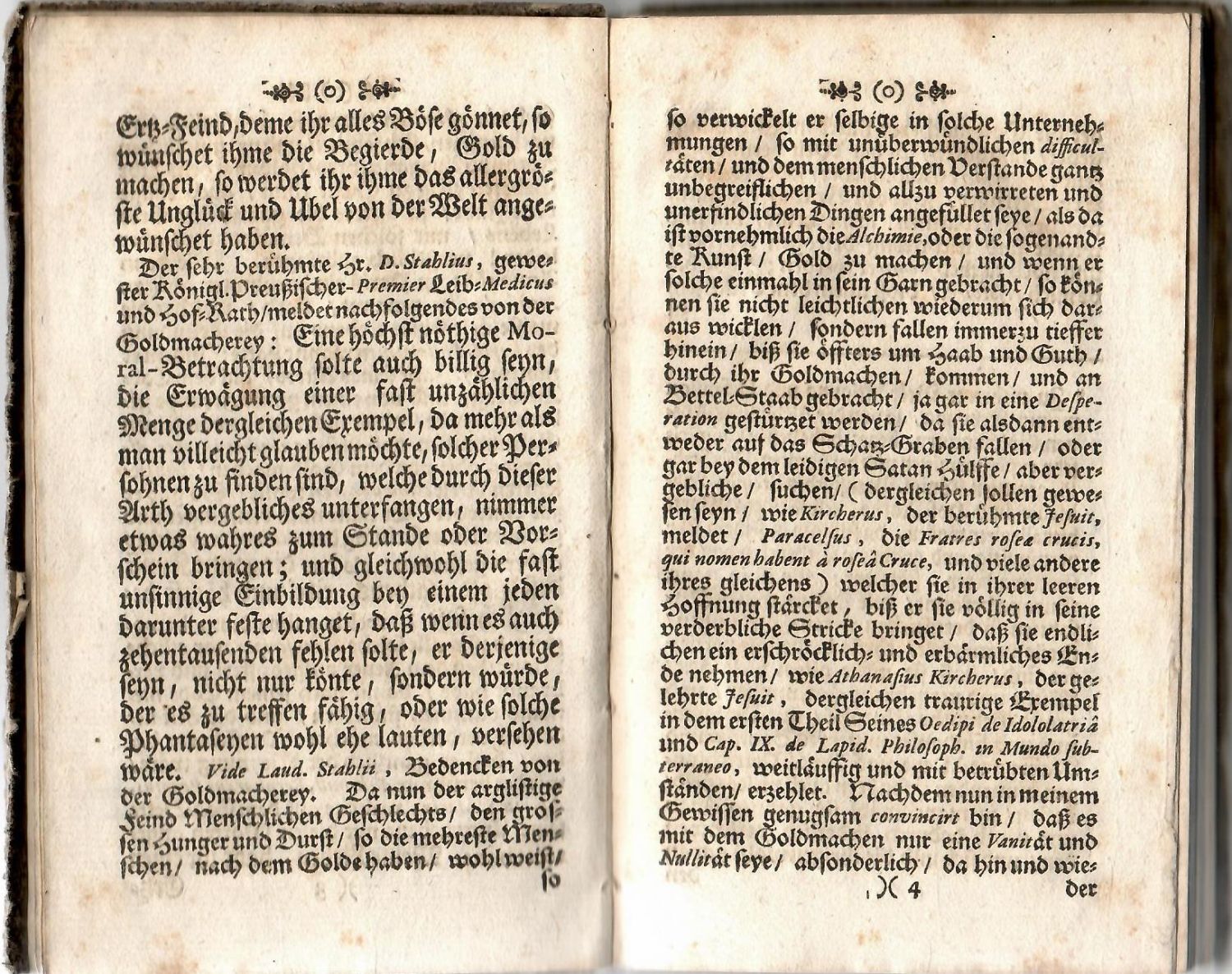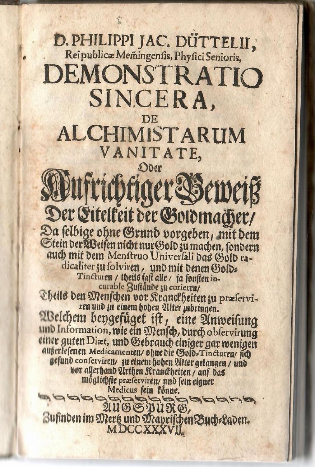 DEMONSTRATIO SINCERA, DE ALCHIMISTARUM VANITATE, Oder Aufrichtiger Beweiß Der Eitelkeit der Goldmacher, Da selbige ohne Grund vorgeben, mit dem Stein der Weisen nicht nur Gold zu machen, sondern auch mit dem Menstruo Universali das Gold radicaliter zu solviren, und mit denen Gold=Tincturen, theils fast alle, ja sonsten incurable Zustände zu curieren, Theils den Menschen vor Kranckheiten zu praeserviren und zu einem hohen Alter zubringen. Welchem beygefüget ist, eine Anweisung und Information, wie ein Mensch, durch observirung einer guten Diaet, und Gebrauch einiger gar wenigen außerleseuen Medicamenten, ohne die Gold=Tincturen, sich gesung conversiren, zu einem hohen Alter gelangen, und vor allerhand Arthen Kranckheiten, auf das möglichste praeserviren, und sein eigner Medicus sein könne.