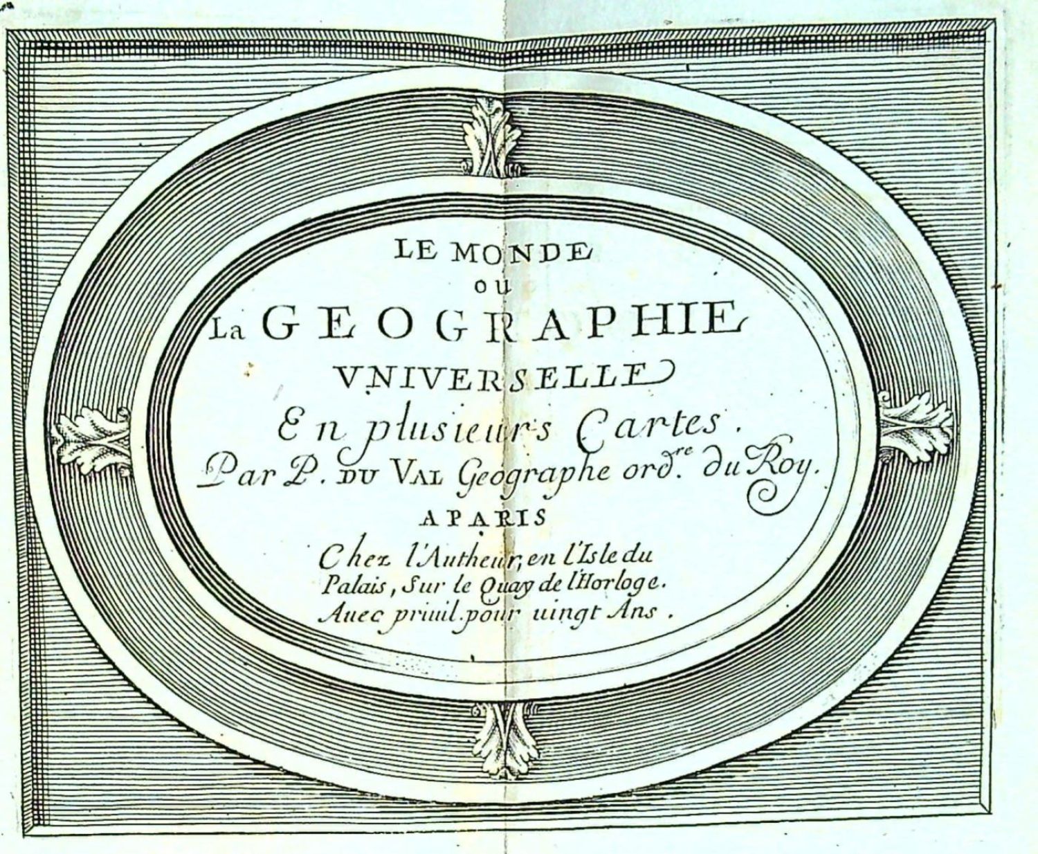 Dva díly průběžně paginované, neživá záhlaví. Konturové iniciály na rostlinném pozadí zalomené do výše 3-4 řádků, tučně tištěné versálky ve výši 2 řádků, v záhlaví první strany dřevorytový vlys, dvě ozdobné tyče z ornamentů. <br>Dobová vazba z hnědé hověziny, ve hřbetu vazy, ve druhém poli tlačený a zlacený název, v ostatních polích tlačený a zlacený ornament, barvené ořízky, na přídeštích dobový tragantový papír, na rubu rytého tit. listu staré razítko Thun-Hoh.. ensteinské knihovny v Děčíne, která byla v roce 1933 rozprodána v Zinkově aukci v Praze. - Vazba ohmataná a místy odřená, zlacení ve hřbetu vybledlé, samotný text a mědirytiny ve stavu velmi dobrém. Rozměr vazby 150 x 95 mm, rozměr map přes dvě strany 102 x 120 mm. <br>Pierre Duval (19.5. 1619 Abbeville - 29.9. 1683 Paříž) francouzský kartograf a vydavatel, pravděpodobně se vyučil v dílnách svého strýce, slavného kartografa Nicolase Sansona.