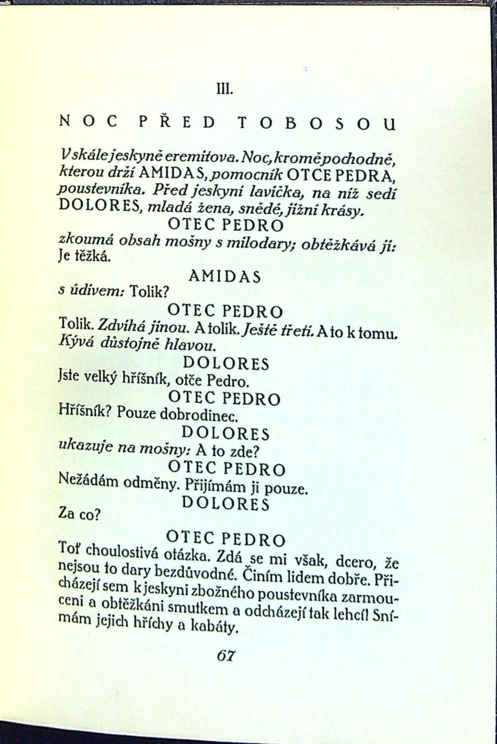 Jeden z 550 vydaných výtisků tištěných na similijapanu Bernhardovým písmem. Dvoubarevně tištěný titulní list, červeně tištěné názvy jednotlivých dějství. Upravil V. H. Brunner, který navrhl též předsádky a podle jehož návrhu knihu do kůže svázal Ludvík Bradáč (temně zelená vepřovice s prolamovaným, v rozích ostrým, tlačeným zrcadlem v jehož středu se nachází ve stylizovaném kruhu tlačený a zlacený květ, přes hřbet podélně rámec z dvojité jednoduché linky, uvnitř jmenný a věcný název, zlacené ořízky, šitý kapitálek. Vazba ve hřbetu lehce odřená, mírně naražené rahy. (V. H. Brunner "Soupis knižní grafiky" str. 42-45).