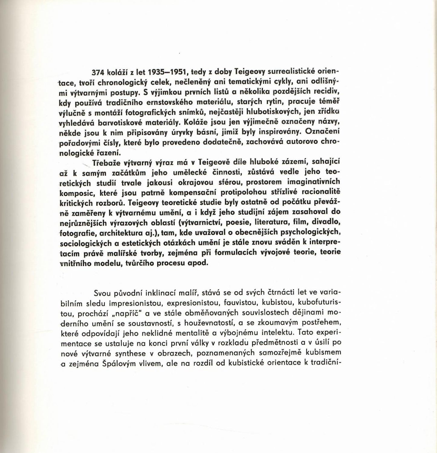 Za úvodním slovem V. Effenbergera, na osmi listech šestnáct fotograf. vyobrazení Teigových koláží. - Pův. pap. obálka s chlopněmi a fotograf. vyobrazením koláže na přední straně. Na několika listech oslí uši.