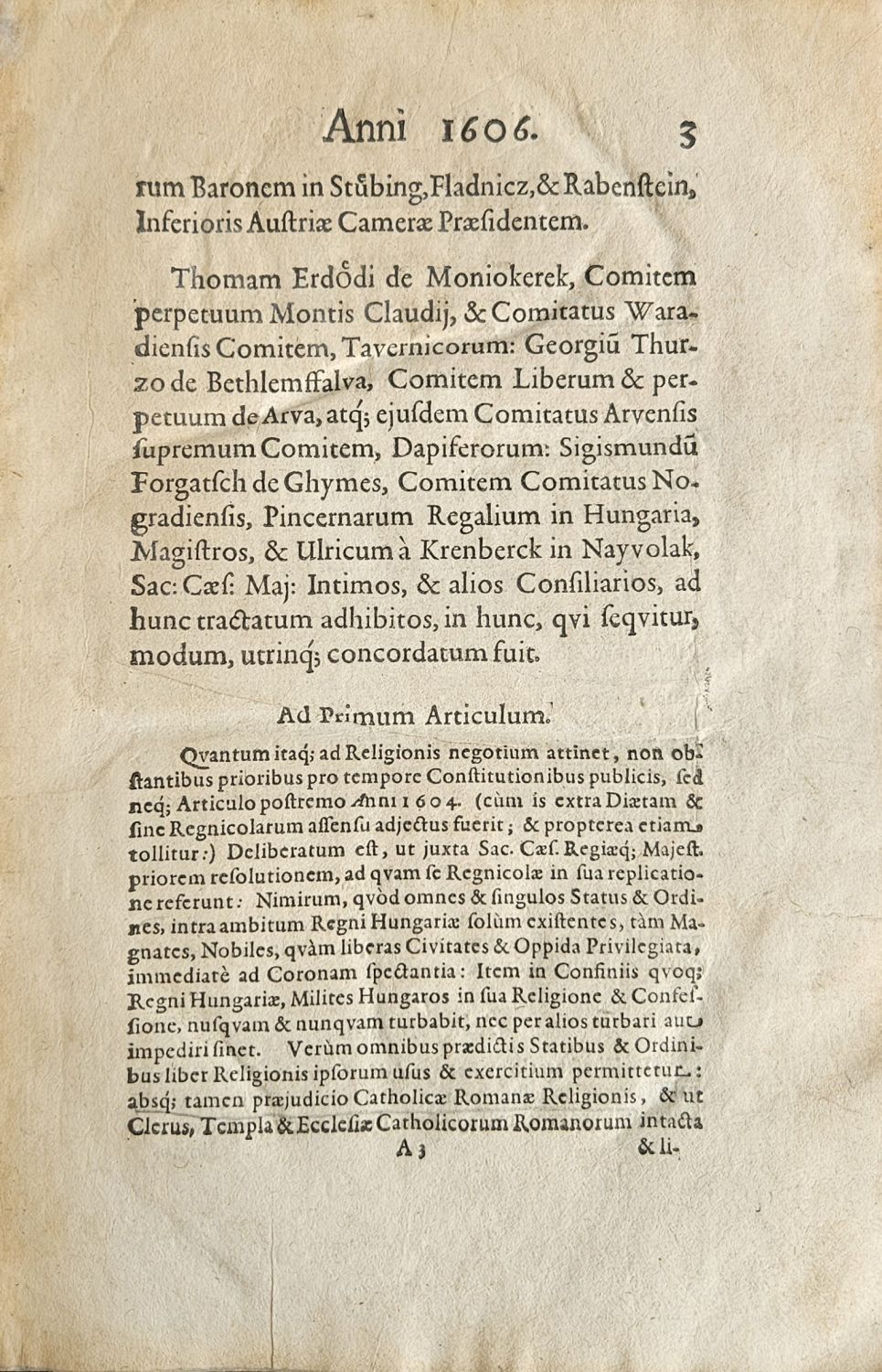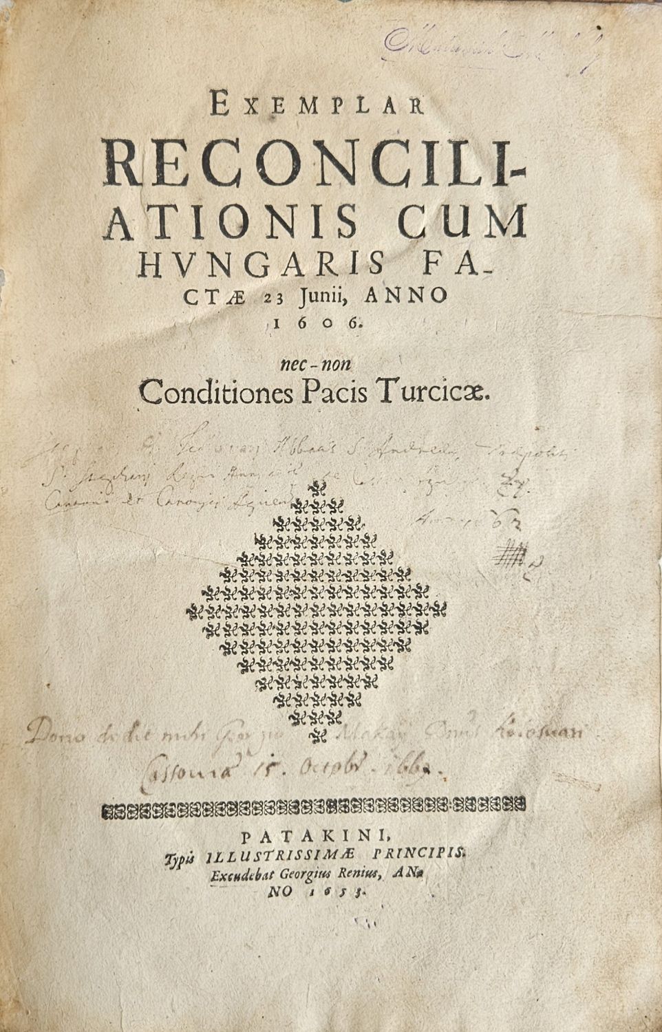 EXEMPLAR RECONCILIATIONIS CUM HVNGARIS FACTAE 23 Junii, ANNO 1606. nec-non Conclitiones Pacis Turcicae.