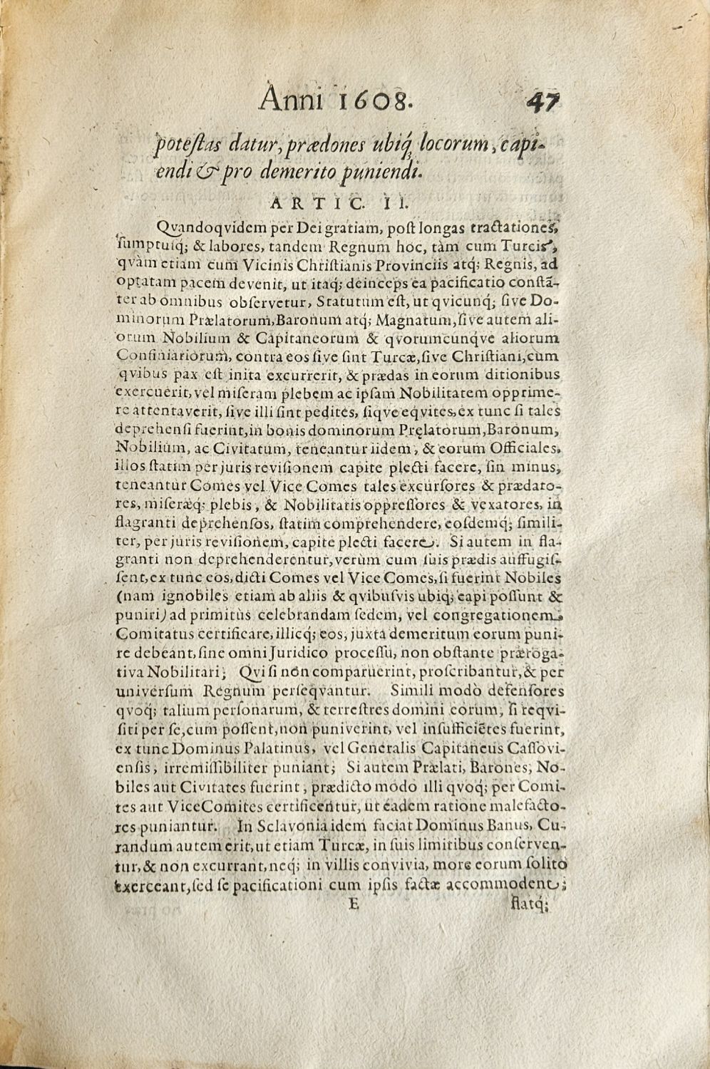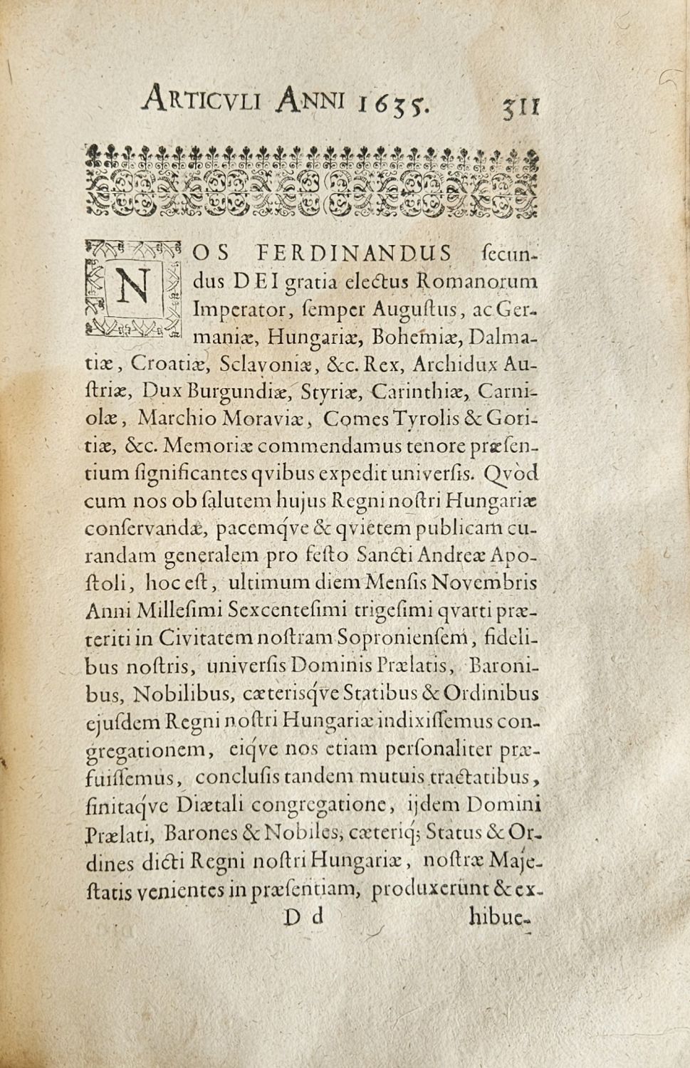 Na tit. listu viněta z drobného ornamentu, pásové vlysy z ornamentů, plné iniciály zasazené v rámečku zdobeným ornamentem zalomené do výše 4-5 řádků, živá záhlaví viněty. Na straně 23 mezititul "CONDITIONES PACIS Inter Romanorum & Turcicum Imperatorem, RVDOLPHVM II. & HEHOMATEM I. Sultanum, ut illae Anno superiori 1606. inter utrosqve tractatae & conclusae sunt", na straně 33 mezititul "Incipiunt ARTICULI Regni Hungariae in diversis Generalibus Diaetis per Status & Ordines ejusdem Regni Hungariae conditi, ac per suas Majestates Regias confirmati; AB Anno Millesimo Sexcentesimo Octavo, usq[ue] ad novissimam Diaetam Anni Millesimi Sexcentesimi Quadrogesimi Noni". Třetí část obsahuje celkem 102 římsky číslovaných artikulů z let 1608-1649.<br>Dobová kartonová vazba potažená pergamenem, pergamenový pokryv zašpiněný a při spodních okrajích desek chybí (cca v šíři 3 cm), při horním okraji hřbetu perem napsaný název. Na tit. listu perem napsaný, zčásti vybledlý provenienční přípis z roku 1662 a druhý z roku 1669 datovaný v Košicích 15. října. Papír místy zahnědlý, světle hnědé mapy od vlhkosti. Knižní blok odborně odkyselený.