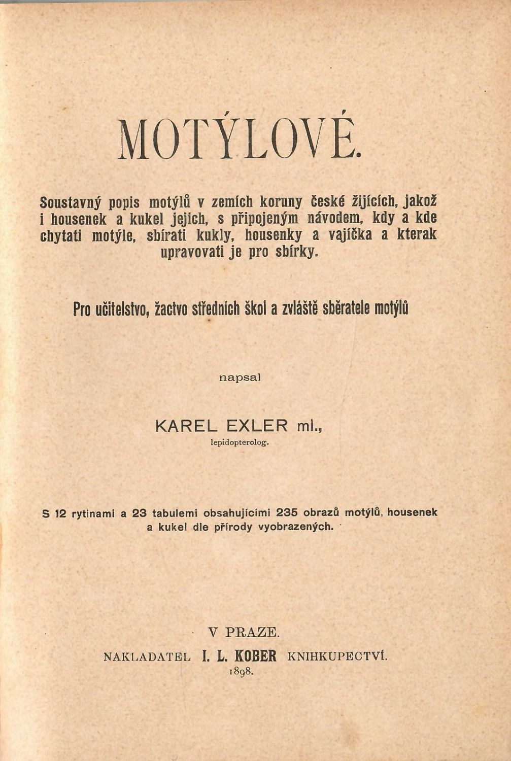 Motýlové. Soustavný popis motýlů v zemích koruny české žijících, jakož i housenek a kukel jejich, s připojeným návodem, kdy a kde chytati motýle, sbírati kukly, housenky a vajíčka a kterak upravovati je pro sbírky.