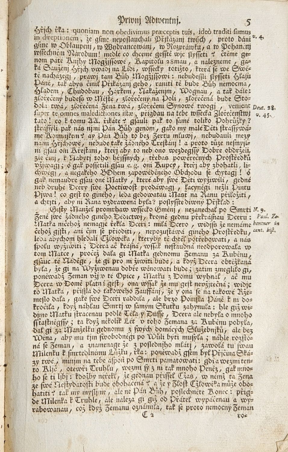 Knihopis 2414<br>Tištěno švabachem, latinský text antikvou, živá záhlaví, iniciály propletené úponky zalomené do výše 2-4 řádků, dvě úvodní ze tří stran olemované ilustrací, barokní viněty, dva vstupní vlysy, ozdobné tyče. Druhý titulní list s názvem "Mrawná Navčenj Na Wssecky Wegročnj Swátky, s přiloženými rozličnými Chwálořečmi Na obzwlásstnj Slawnosti, wydaná ....".<br> Karton. vazba z 19. století potažená mramorovaným papírem (původně kůží, na několika místech se nachází torso pův. pokryvu zdobeného slepotiskem), kožený hřbet a nárožnice. Pap. pokryv místy sedřený, při spodním okraji přední desky chybí, kůže při horním okraji hřbetu potrhaná, na přední desce spodní nárožnice chybí, na předním přídeští nalepen úřední papír z 20. století, na zadním přídeští a předsádce tragantový papír z 19. století. Titulní list první knihy zašpiněný a lehce pomačkaný, knižní blok zčásti rozvolněný. U obou knih chybí rejstříky. Druhá kniha vyšla roku 1763.