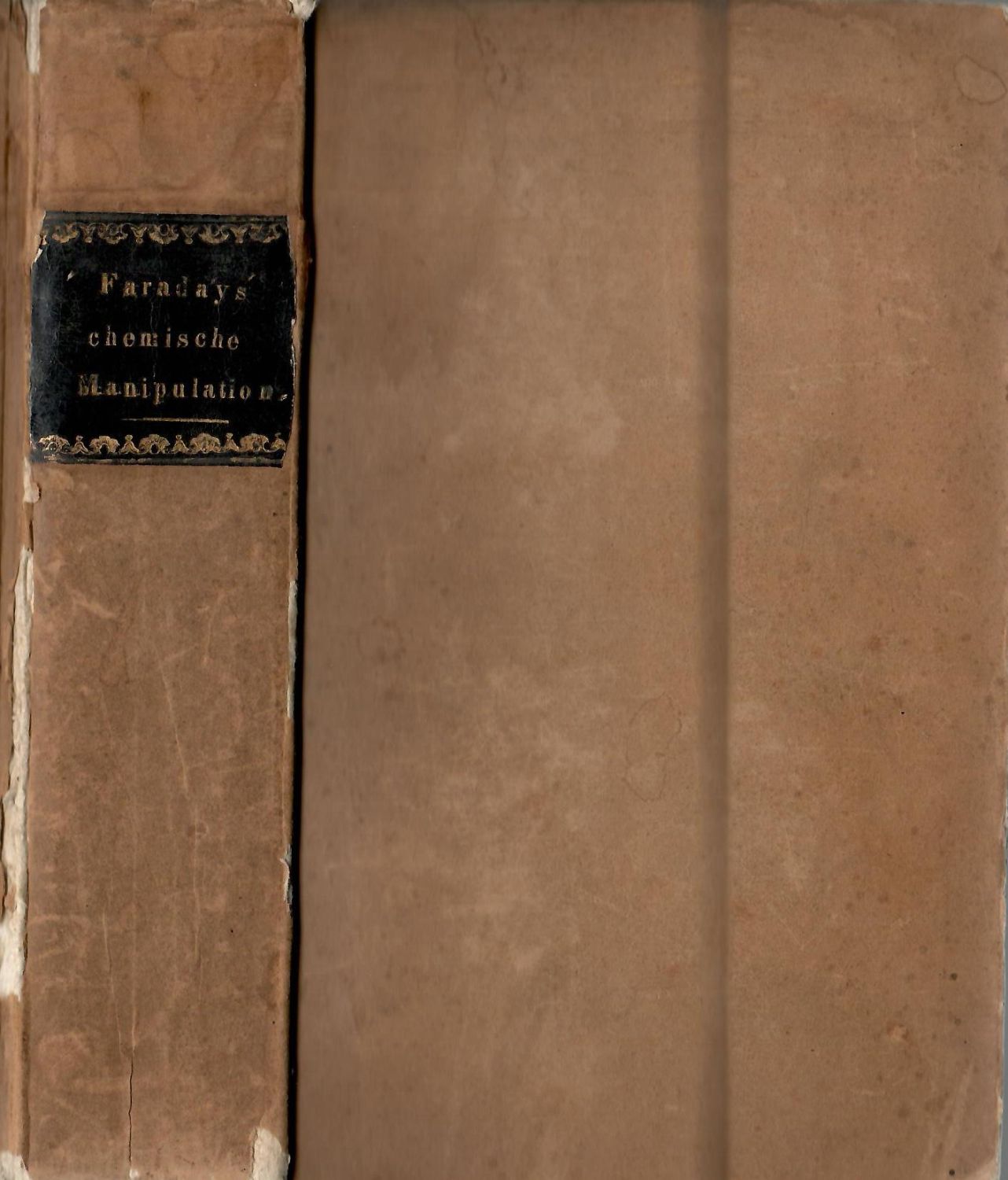 Tištěno gotikou, francouzská a anglická slova antikvou, tištěné poznámky pod čarou, paragrafy. V textu 5 rozkládacích litografických příloh se 135 vyobrazeními, 11 rozkládacích tabulí s nabídkou a anotací knih vydaných nakladatelstvím. Druhá část se samostatným titulním listem "Nachträge zur ersten Ausgabe von Faraday´s chemischer Manipulation" (nach dem zweiten Ausgabe des Originals), Weimar, 1832.<br>Dobová kartonová vazba, ve hřbetu dobový černý kožený štítek s tlačený a zlaceným názvem, vazba ohmataná, při okrajích hřbetu odřená, naražené rohy. Na tit. listech vybělený pruh (pravděpodobně po odstraněném prov. záznamu), na několika listech drobné hnědé skvrnky.<br>Michael Faraday (22.9. 1791 Newington - 25.8. 1867 London), významný anglický chemik a fyzik. Roku 1831 objevil elektromagnetickou indukci, magnetické a elektrické siločáry a položil tím teoretický základ pro všechny druhy elektromotorů a dynama. V nabízeném díle zaznamenává a popisuje své objevy z oblasti experimentální chemie.