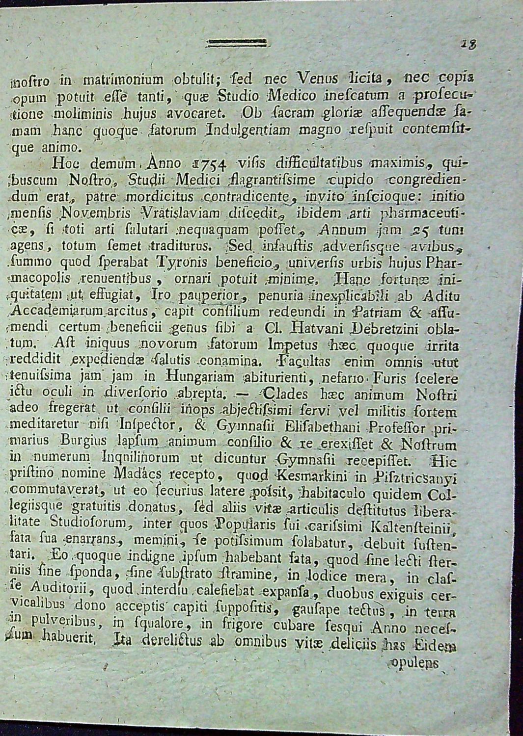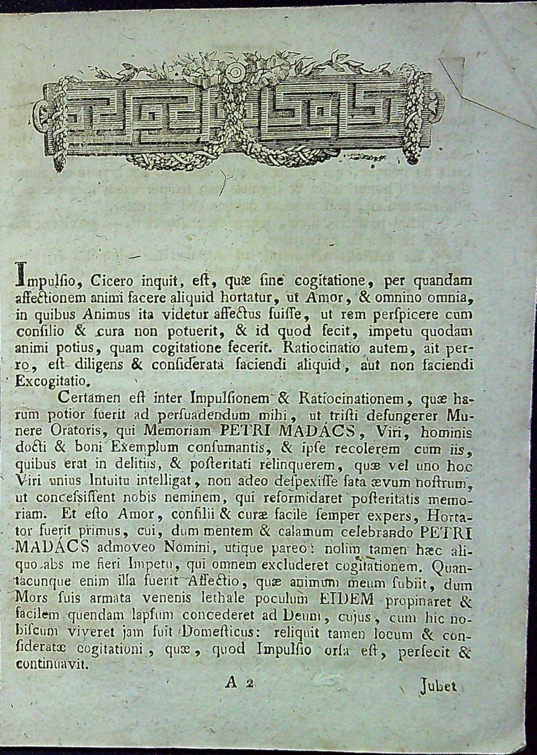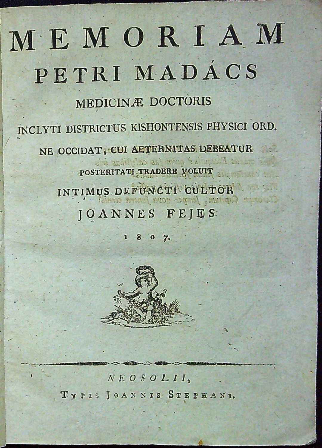 Rýzner I,383,6<br>Tištěno antikvou, signatury, stránkové kustody, arabská paginace stran při horním vnějším okraji. Na tit. listu a na konci viněty s andílkem, uprostřed horního okraje stran dvojitá mizící linka, vstupní pásový vlys s geometrickým ornamentem protkaným rostlinným věncem.<br>Dobová obálka z olejového papíru zdobeného rostlinným dekorem. Místy oslí uši.<br>Ján Feješ (2.7. 1764 Toporec - 16.3. 1823 Nižný Skálnik). Vystudoval právo na universitách ve Vídni a v Göttingenu, poté se usadil v Nižném Skalníku, kde se stal církevním inspektorem a později gemerským protonotářem. Stál u zrodu "Učené společnosti malohontské", která v letech 1808-1842 působila v oblasti Malohont (v oblasti Rimavské Soboty a od roku 1802 též v Gemeru). Ján Fejéš byl autorem řady knih náboženských, právnických, jazykovědných a historických. Publikoval v latině, němčině, maďarštině a slovenštině. - Nabízená práce je věnována vzpomínce na významného lékaře Petra Madácse (1729-1805), který působil jako hlavní lékař župy v Rimavské Sobotě a významně se zasloužil o zlepšení úrovně zdravotnictví v oblasti.