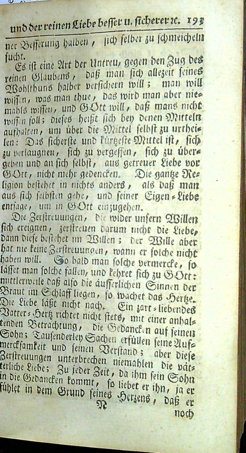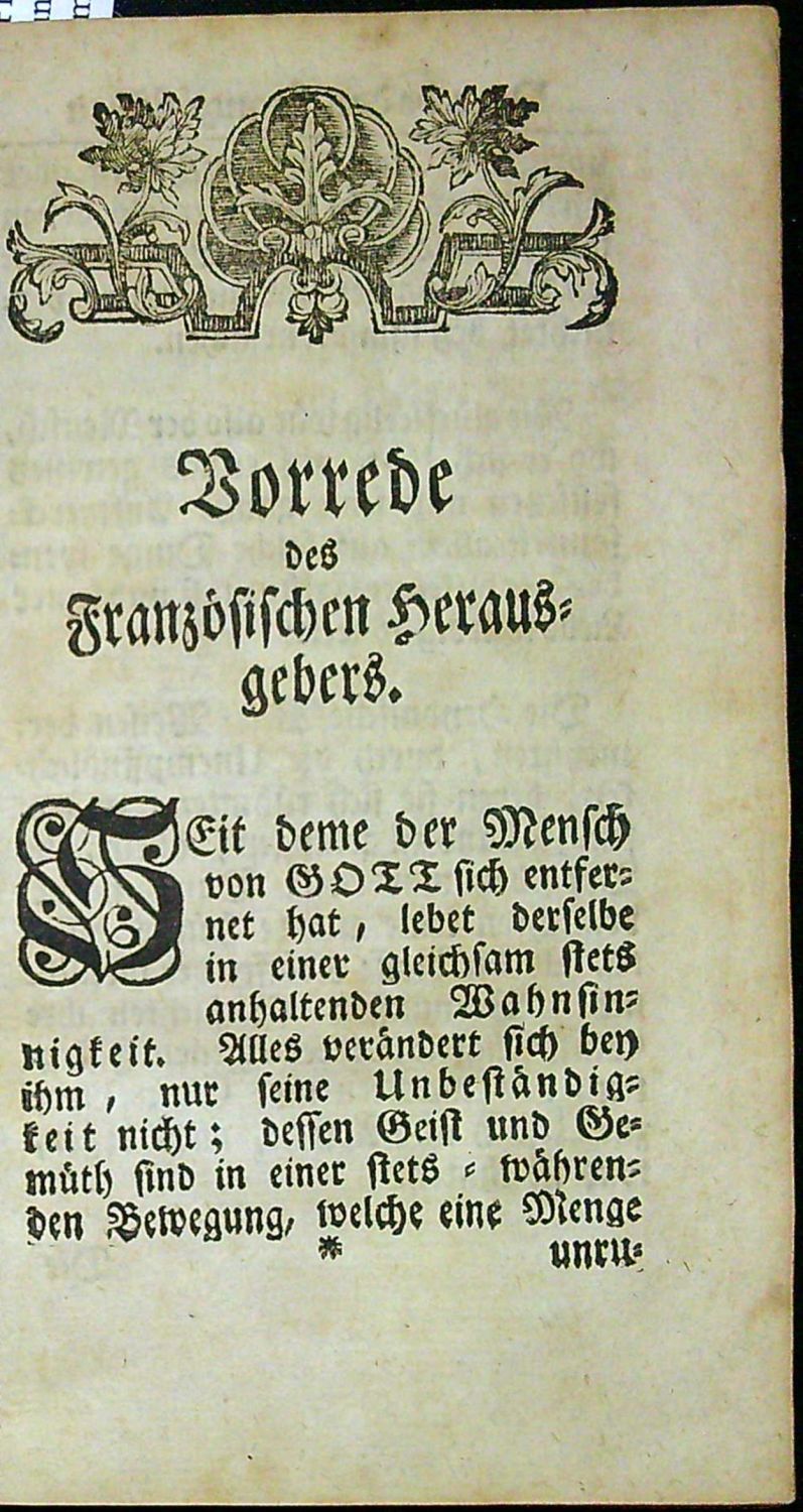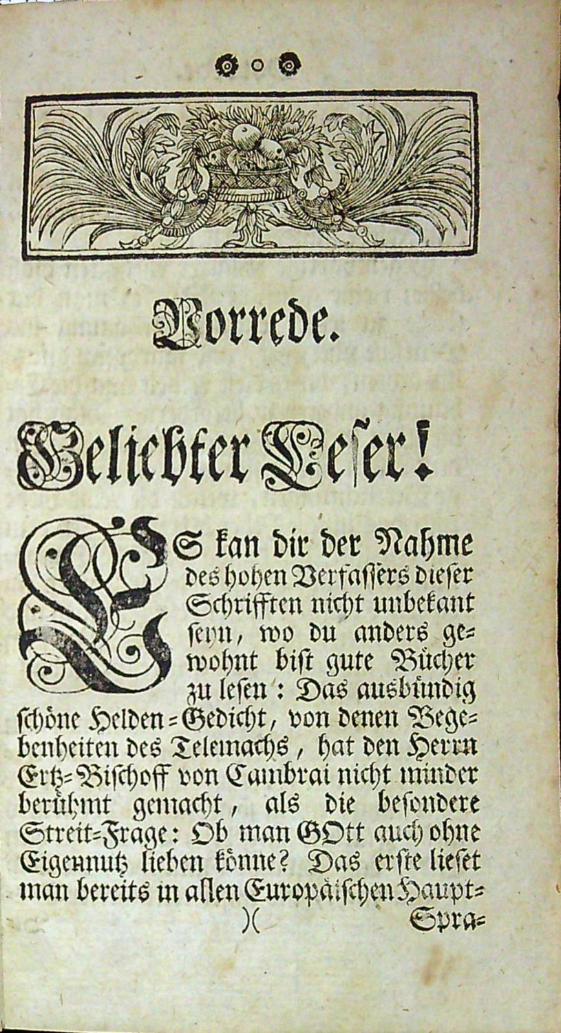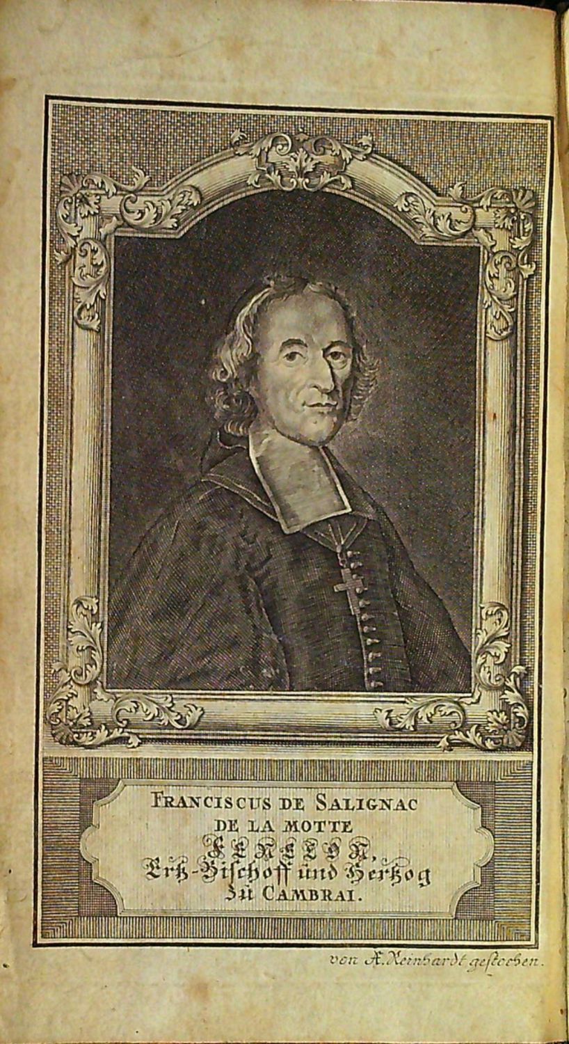 Tištěno švabachem, latinská slova antikvou, živá záhlaví od sazby oddělená jednoduchou linkou, červeno-černě tištěný titulní list prvého dílu, pásové vlysy, viněty, iniciály propletené úponky zalomené do výše 4-6 řádků, tučně tištěné plné iniciály ve výši 2 řádků, tři titulní listy (třetí pouze s názvem). Ve front. prvního dílu mědirytina s portrétem autora signovaná A. Reinhardt.<br>Dobová vazba s kartonovými deskami potaženými tragantovým papírem, pergamenový hřbet a nárožnice, barvené ořízky. Vazba zaprášená a místy odřená, pergamen ve hřbetu zkrabatělý a místy potrhaný, na tit. listu prov. záznam (nečitelné jméno) z 18. století.<br>Francois de Salignac de la Mothe-Fénelon 6.8. 1651 Sainte-Mondane - 7.1. 1715 Cambrai), byl francouzský teolog, básník a spisovatel. Od roku 1696 arcibiskupem v Cambrai, stoupenec kvietismu. Jeho nejznámějším dílem jsou "Příhody Telemachovy", které vyšly poprvé francouzsky v letech 1693-94. - Nabízené dílo obsahuje jeho duchovní spisy a ve třetím díle autorův životopis.
