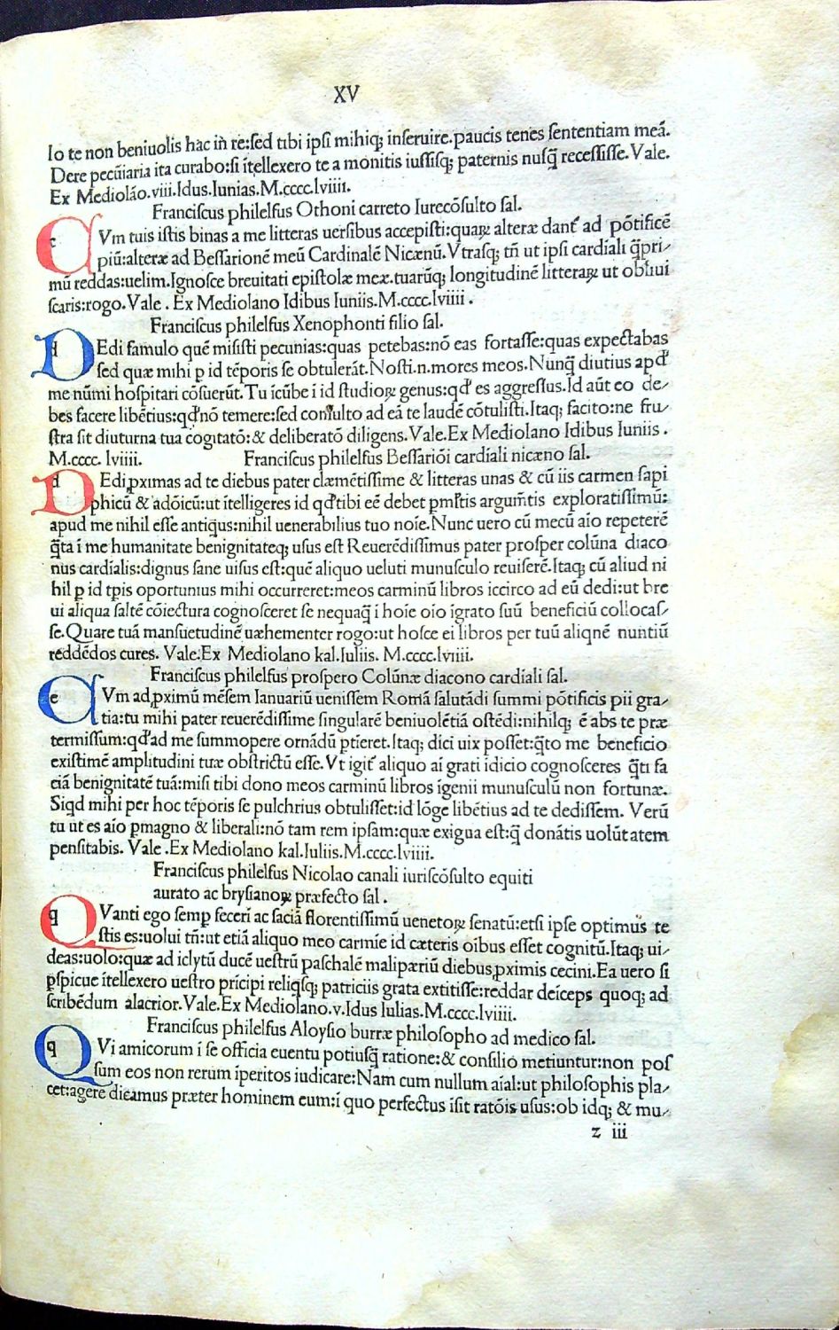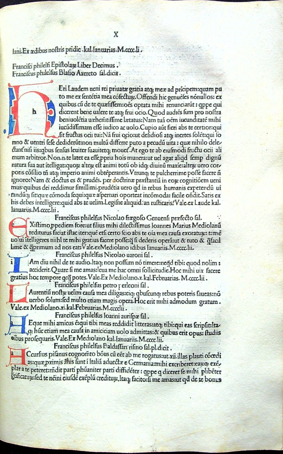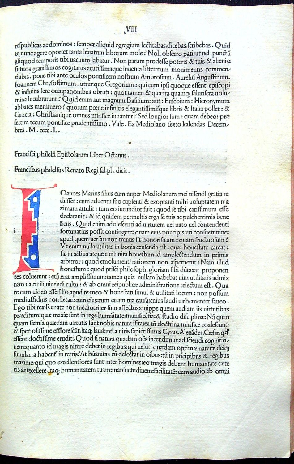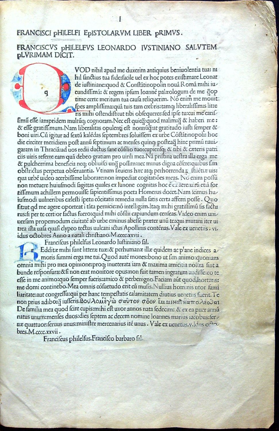 ISTC ip00584000; HC 12933; GW M32971; BMC VII,973; Goff P-584<br>Tištěno antikvou, 44 řádků, v textu řada červených a modrých kaligrafických iniciál ve výši 2-3 řádků, v úvodu jednotlivých epištol 14 červeno-modrých malovaných iniciál ve výši 6-7 řádků, vstupní červeno-zeleno-modrá malovaná iniciála ve výši 7 řádků, červeno-modrá iniciála ve výši 11 řádků na foliu 15a v úvodu 8. epištoly. Signatury, uprostřed horního okraje stran římsky vyznačené jednotlivé epištoly (I-XVI).<br>Vazba z temné hověziny z počátku 18. století (300 x 215 mm), ve hřbetu 3 vazy, ve druhém poli štítek z hnědé teletiny olemovaný zlaceným rámem se zlaceným a tlačeným názvem, červeně barvené ořízky. Na rubu posledního listu (rejstříku) rkp. přípis z konce 15. či počátku 16. století v latinském jazyce. - Chybí folio a1 (nepotištěné), folio a2 restaurované (odtržený papír při dolním okraji po text v šíři cca 60 mm dolitý), folia a7, a8 při spodním vnějším okraji restaurované (původně natržený papír scelený), folia g2 a h2 při spodním okraji lehce natržené, folio u1 s malou dírkou při horním vnitřním okraji, poslední list zčásti utržený od knižního bloku a při spodním vnějším okraji utržený kus papíru (bez ztráty textu). Na několika listech hnědé skvrnky a při spodním vnějším okraji stopy způsobené vlhkem. V první třetině knihy při spodním okraji (mimo text) malá dírka od červotoče.<br>První datované vydání, v pořadí druhé; první vydání vyšlo v Benátkách roku 1473, bez uvedení místa tisku, tiskaře a datace.<br>Francisco Filelfo (25.7. 1398 Tolentino - 31.7. 1481 Florencie), byl italský renesanční humanista. Sehrál významnou roli v oživení zájmu o klasické učení v Itálii. Vystudoval v Padově, v Benátkách se stal profesorem rétoriky. Byl jmenován sekretářem benátského konzula v Konstantinopoli, kde nashromáždil velkou sbírku řeckých dokumentů. Po návratu do Itálie se stal profesorem řečtiny a latiny ve Florencii. Díky svému vznětlivému temperamentu, kritickému psaní a zesměšňování přátel i nepřátel často měnil místa svého působiště. Roku 1475 byl pozván do Říma papežem Sixtem IV. a stal se profesorem rétoriky, po roce z Říma v důsledku neshod s papežem odešel. Filelfus je jedním z největších renesančních italských humanistů, díky své znalosti řečtiny přeložil celou řadu klasických autorů (Aristoteles, Plutarchos, Xenofón ...) do latiny a významně tak přispěl k oživení zájmu o řeckou kulturu.