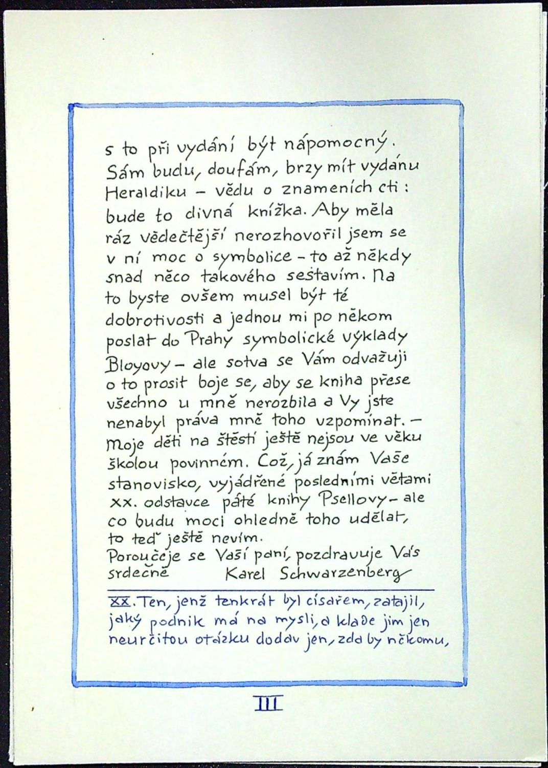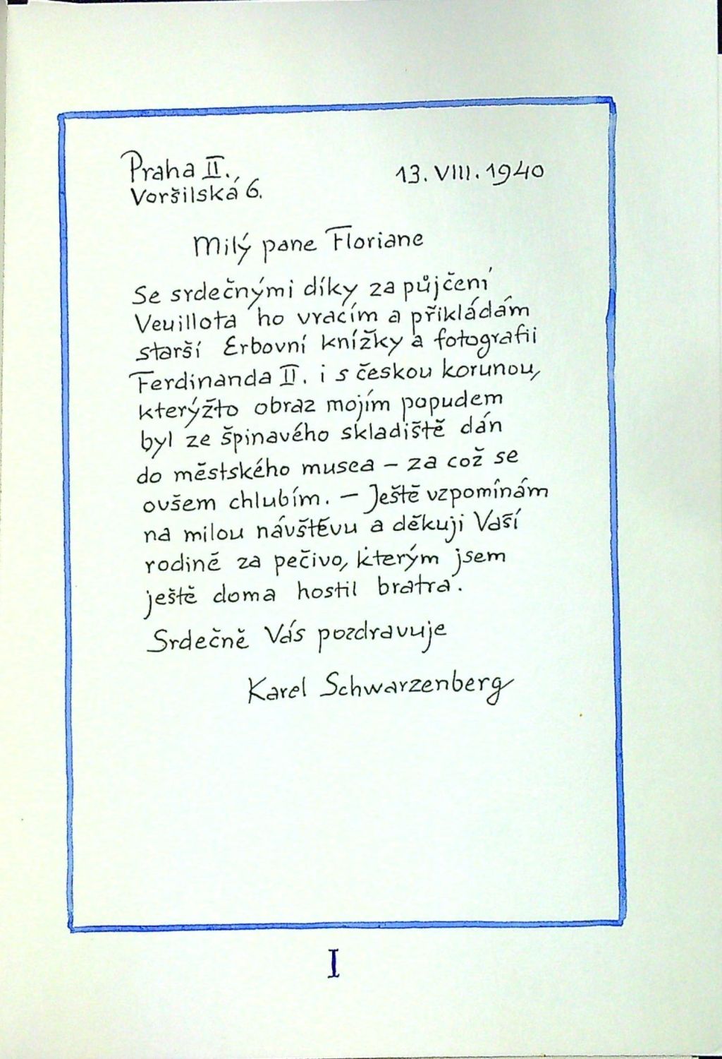 Kaligraficky psaný rukopis černým perem (přepis dopisů K. Schwarzenberga) a modrým doplňující poznámky J. Floriana. Rukopis obsahuje celkem 10 dopisů z let 1940-41. Na líci prvního listu rkp. dedikace Josefa Floriana ml. datovaná ve Staré Říši 1983 "Váženému pánu p. Primáři Dr. Jaroslavu Pitterovi pozdrav a blahopřání k jmeninám! U příležitosti Vašeho svátku rád bych se s Vámi rozdělil o milou vzpomínku na vlahé léto 1940, kdy mého otce navštívil vzácný host. Ne tak vzácný rodem, ale tím, "naráz se sdružil" s myšlením mého otce, upřímně jako upřímná snaha v hledání pravdy ho vedla do Staré Říše. Těch několik dopisů hodně poví o hloubce úcty a přátelství. Josef Florian". Na rubu dalšího listu při horním okraji uchycen fotografický portrét knížete Schwarzenberga, na lící dalšího listu červeno-černě psaný tit. list s modrým erbem, na dalších 7 římsky číslovaných listech dopisy - poslední list popsaný pouze na líci s nalepenou reprodukcí fotograf. portrétu Josefa Floriana s datem narození a úmrtí. Rukopis psaný na tuhém papíru a text na všech listech olemovaný modře nakresleným jednoduchým rámečkem. - Žlatá papírová obálka s chlopní s modře namalovaným erbem na straně přední. Přiloženo úmrtní oznámení o smrti knížete Karla z 10. dubna 1986, strojopisný opis v Čechách nepublikovaného článku Jožky Pejskara "Dr. František Schwarzenberg sedmdesátník"