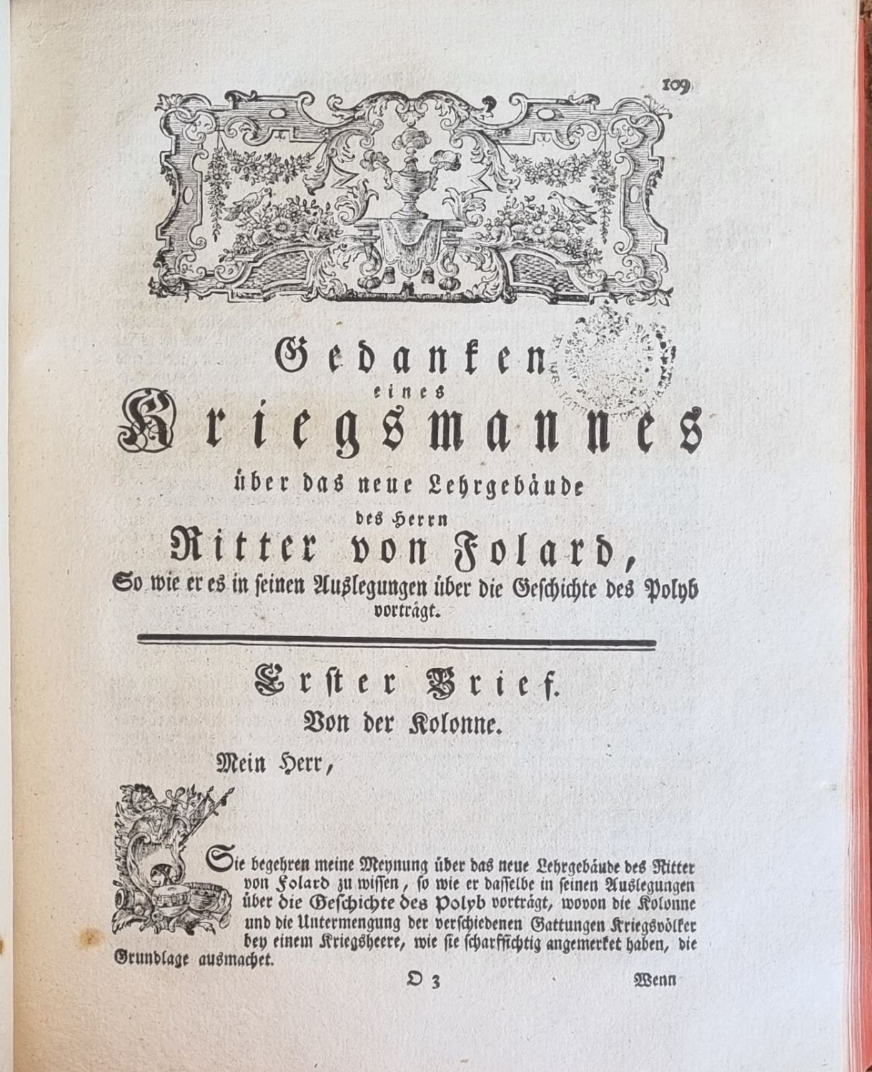 Pumprla I,3595; Holzmann-Bohatta III, 9284<br>Text tištěný švabachem, latinský antikvou, řecký alfabetou, živá záhlaví, tištěné poznámky pod čarou a po stranách, tučně tištěné iniciály ve výši 2-3 řádků, na tit. listu signet tiskaře Trattnera, vlysy, viněty, několik iniciál v rokokových ilustracích, v textu několik schematických vyobrazení. Osm mědirytinových příloh (z toho 4 rozklápěcí)s vyobrazením různých příkladů postavení vojenských jednotek a s příklady lineárních formací.<br>Dobová vazba z hnědé hověziny, ve hřbetu 5 vazů, ve druhém poli původní světle hnědý kožený štítek s tlačeným a zlaceným názvem, v ostatních polích tlačené a zlacené ornamenty, červeně barvené ořízky. Vazba ohmataná a odřená, při horním okraji hřbetu natržená, při spodním chybí kousek koženého pokryvu, zlacení vybledlé. Při horním vnitřním okraji přední desky vazby torso starého papírového štítku s číslem. Na tit. listu staré prov. razítko "Academ. bibliotheca Crem?".<br>Kniha vyšla jako dodatek (sedmý díl) k šesti dílům díla "Geschichte des Polyb", které vydal Trattner v letech 1759-1760.<br>Jean Charles de Folard (13. 2. 1669 Avignon - 25. 3. 1752 Avignon), francouzský důstojník a vojenský teoretik. Ve svých spisech rozvíjel různé taktické teorie, některé na svoji dobu velmi průlomové, jiné dosti nekonvenční či hraničící s čistou fantasií. Stál u zrodu lineární taktiky. Jeho nejznámější dílo "Dějiny Polybia" vyšlo poprvé francouzsky roku 1735 v Amsterdamu a zapůsobilo tak silně na Friedricha Velikého, že je učinil základem pro příručku svých důstojníků a lineární taktiku velmi úspěšně využil během sedmileté války. Také Napoleon jeho myšlenky efektivně zužitkoval během svých dobyvatelských tažení.