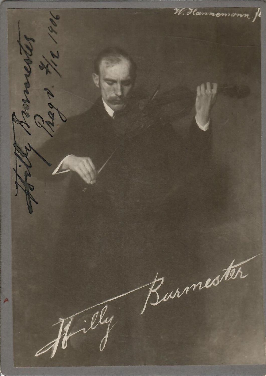 Původní fotografie (178 x 128) z atelieru W. Hannemann s podpisem Willy Burmestera a datací "Prag 7/12 1906". <br>Willy Burmester (16.3. 1869 Hamburg - 16.1. 1933 Hamburg) významný německý houslista.