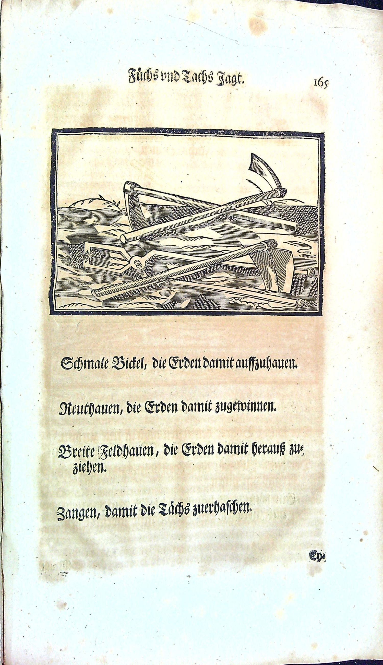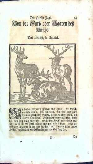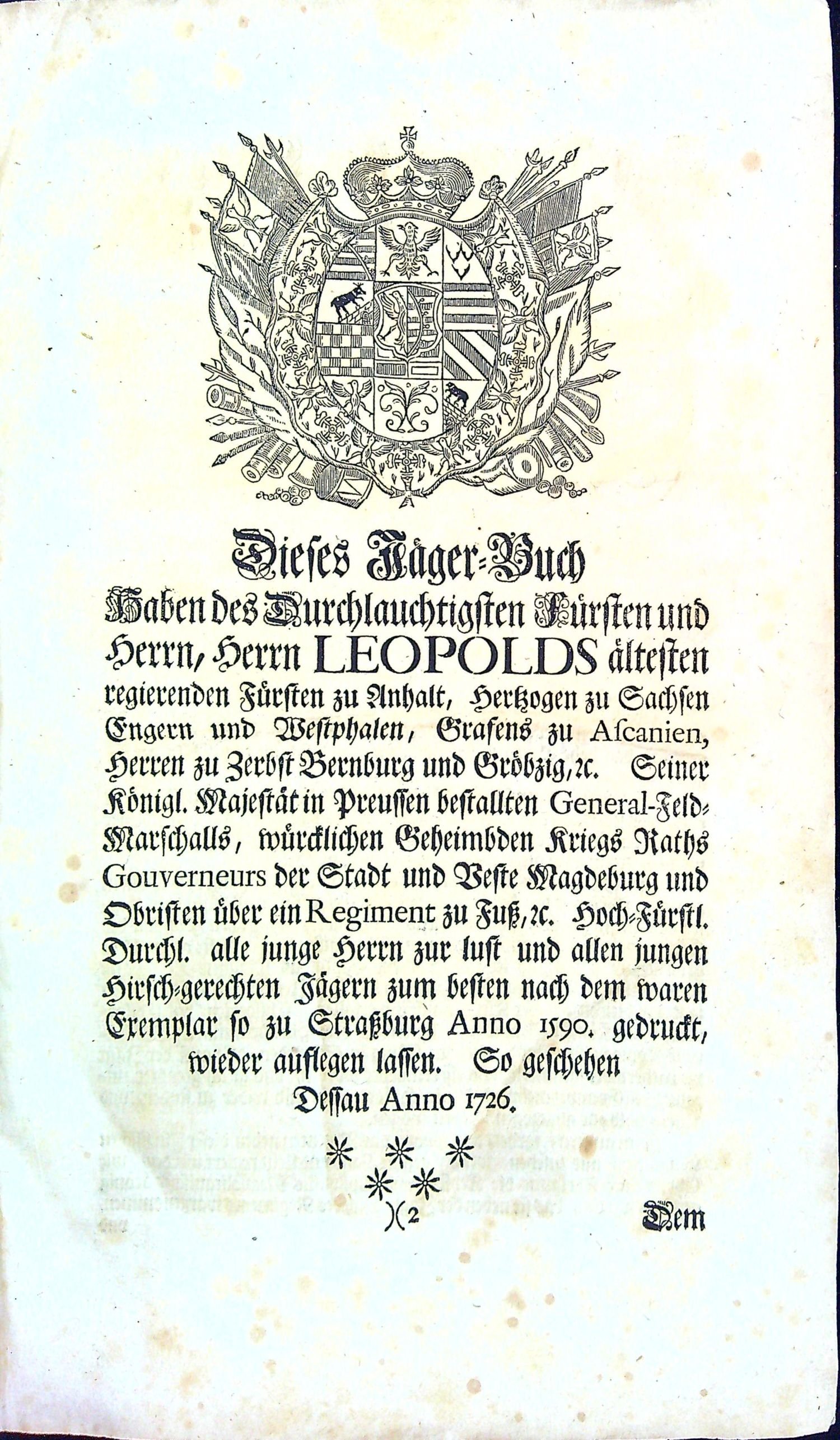Tištěno švabachem, latinská slova a francouzský text v obsahu antikvou. Neživá záhlaví, tučně tištěné iniciály propletené úponky zalomené do výše 2-10 řádků, v úvodu prvé části konturová iniciála na ilustrativním pozadí (ptáček sedící na větvi) zalomená do výše 8 řádků. Ozdobné lišty z ornamentů, viněty, červeno-černě tištěný titulní list s dřevorytovou vinětou, na líci druhého listu erb knížete Leopolda von Anhalt-Koethen, pod ním tištěná dedikace datovaná v Dessau 1726. Druhá část se samostatným titulním listem "Johansen von Clamorgans, Heeren van Saane, Oberhauptmanns auff der See gegen Nidergang in Francreich Wolffs=Jagt, .....", na titulním listu dřevoryt s vyobrazením štvanice (125x135 mm).