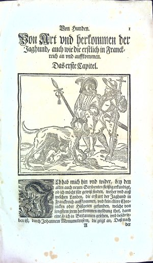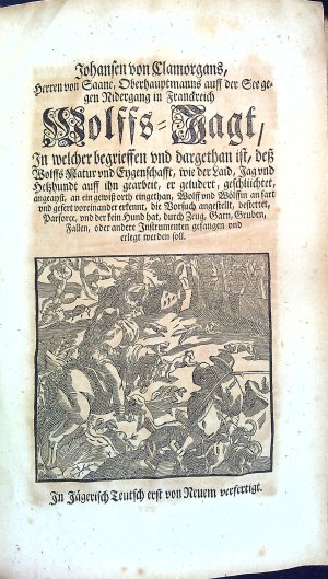 Neu Jägerbuch: Jacoben von Fouilloux, einer fürnehmen Adelsperson in Franckreich aus Gastine in Poitou. Darinn gründlich beschrieben und zu finden, Vom Jäger, der Jagten anfang, des Jägers Horn und Stimm, wie er sich deren auff der Jagt, recht gebrauchen, und artige Hifft Blasen soll, und was zu jedem sonst besonderes mehr erfordert wird. Auch von Laid, Jag, Hetz und allerley Hunden, ihrer art und herko[m]men, Welcher gestalt und zeit, sie zubelegen, Welffen sollen, von der Wuot, Raud und andern zufällen, zu retten, und zuverwaren, wie sie auff allerhand Wildpreth, und zum Horn, anzubringen, zu arbeiten, mit hoher verrer Nasen verfahen, die fährt einfallen, beharren, verfallen, und auff der Jagt fürzulegen, zu Passen, zupfneyschen, etc. Item von der Hirsch, Schweins, Hasen, Fuchs und Dachs Jagt, das ist von .....,.