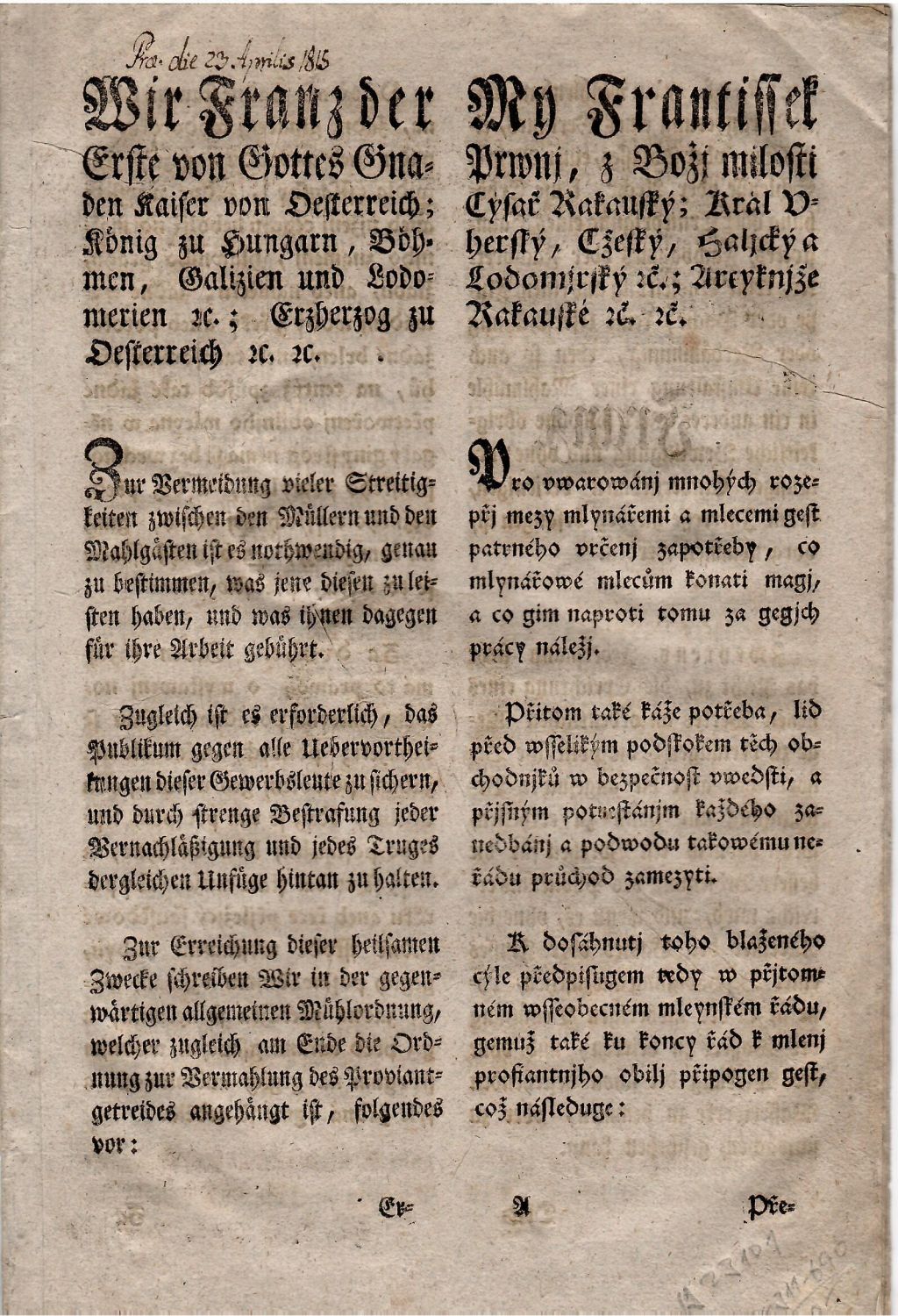 Gotika, signatury, stránkové kustody. Tisk ve dvou sloupcích, v levém německy, v pravém česky. Plné iniciály ve výši 1 řádku, na posledním listu pod tištěným podpisem císařovým locum sigilli. Na prvním listu nad textem přípis perem "... 23. Aprilis 1815".