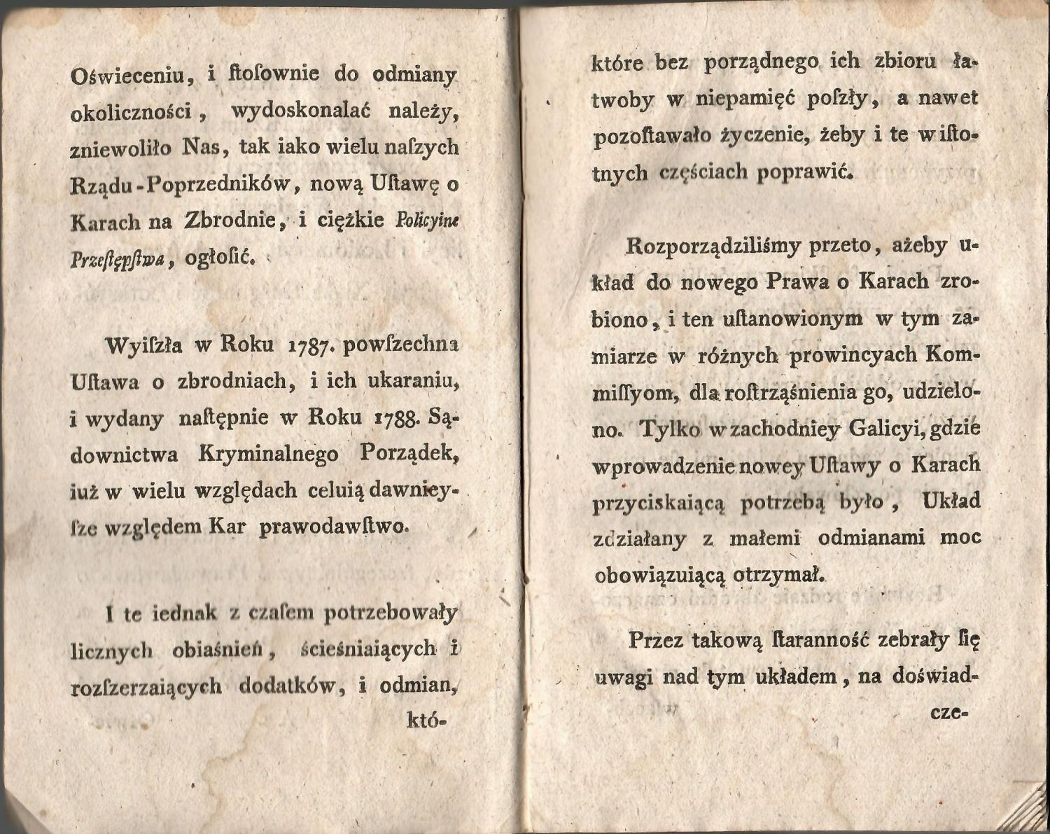 Tisk antikvou, tištěné poznámky po stranách, celkem 557 arabsky číslovaných paragrafů. Jednoduché i prolamované ozdobné linky, na tit. listu viněta s císařským znakem, v úvodu předmluva císařova. - Sbírka zákonů o trestných činech a závažných politických deliktech, která vyšla poprvé 1787 v německém jazyce ve Vídni, roku 1804 v upravené verzi polsky u příležitosti prohlášení západní Haliče jako korunní země Rakouského císařství.<br>Dobová vazba (obálka) z olejového papíru, místy lehce vybledlá a odřená, na předním přídeští lehce patrné zbytky vyradýrovaného razítka, na několika listech světlé mapy způsobené vlhkostí, oslí uši.