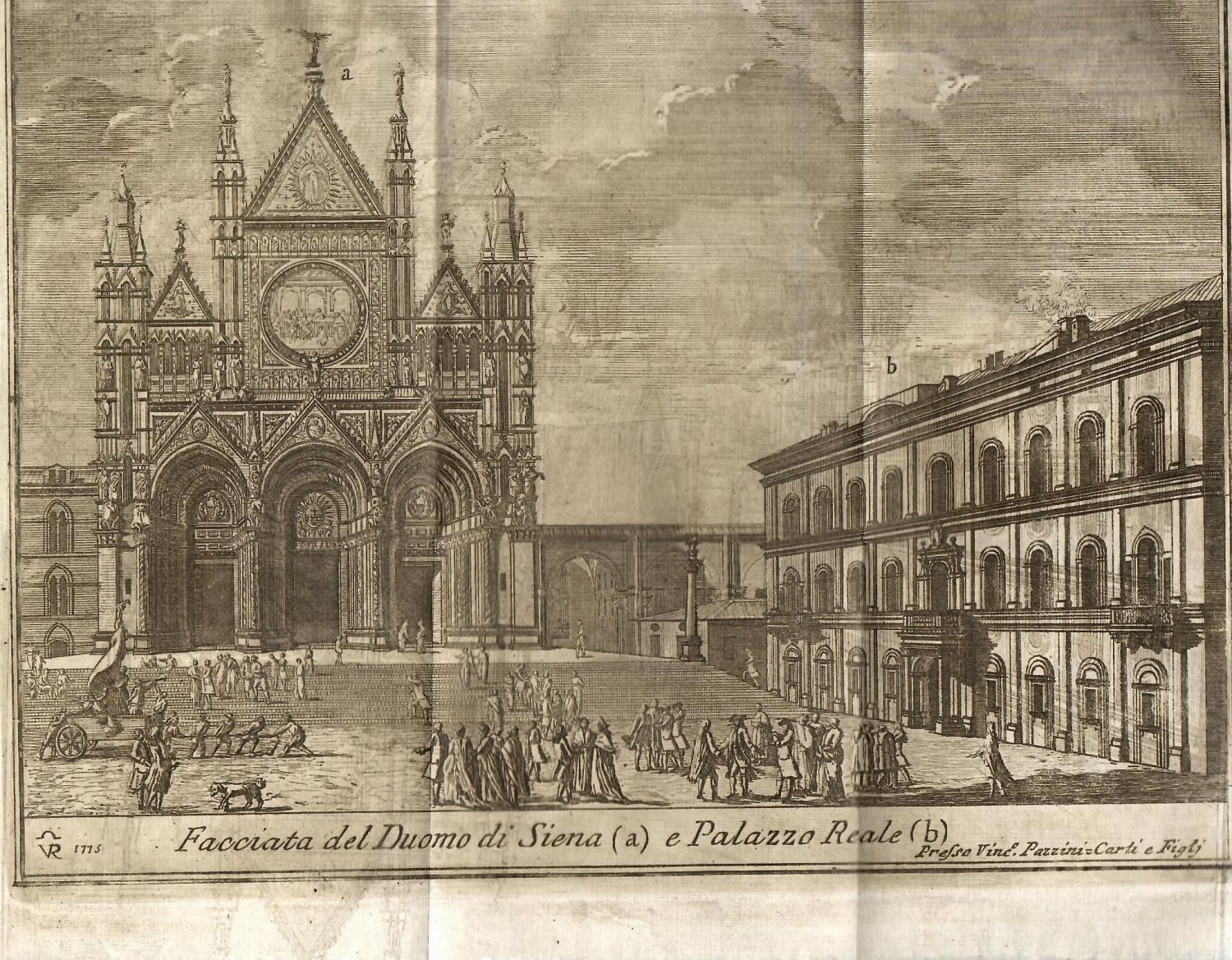 | Ilustrace: | Rozkládací mědirytinová příloha (rozměr desky 200 x 260 mm, 225 x 275 celý papír) s pohledem na sienský dóm a palác "Reale", vlevo dole v desce monogram VR a datace 1775, vpravo dole Presso Vinc. Pazzini. Koncová viněta. |