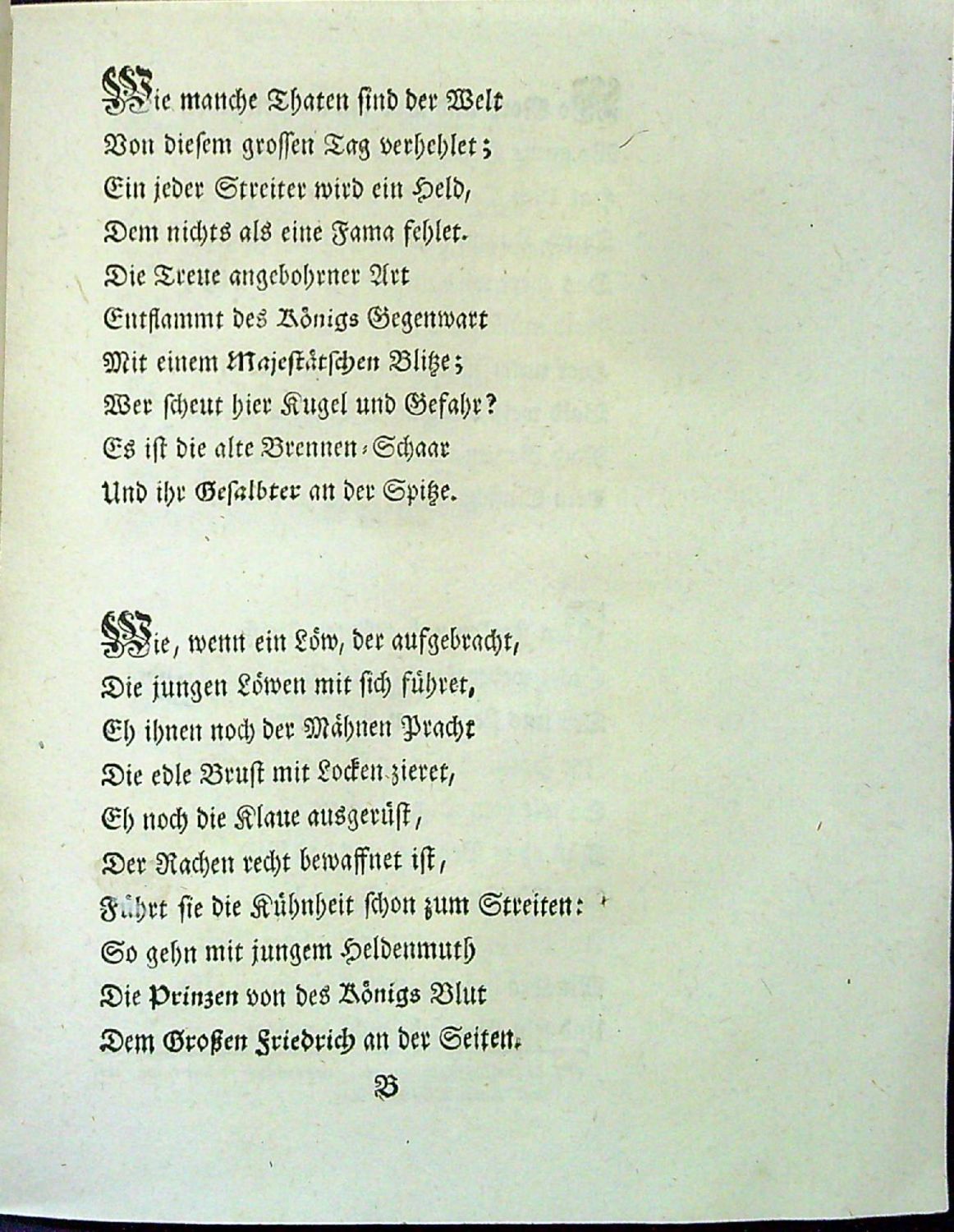 Tištěno švabachem, latinské motto na rubu tit. listu a latinské poznámky pod čarou antikvou, vstupní pásový vlys, koncová viněta, tučně tištěné iniciálky, vstupní zasazená do ilustrace. - Původní brožura přes hřbet přelepená dobou pap. páskou z mramorovaného papíru.<br>Anonymní autor ve 23 nečíslovaných slokách oslavuje vítězství pruského krále Friedricha II. nad Marií Terezií v bitvě u Hohen=Friedebergu (Dobromierz v Dolním Slezsku), která proběhla 4.6. 1745 a skončila drtivou porážkou rakousko-saského vojska.